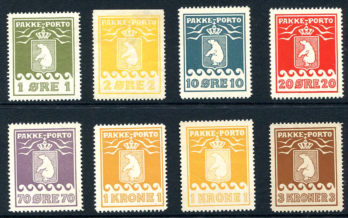 Mint hinged assembly of 8 different "Arms of Greenland" Parcel Post stamps, offered as received on a stockpage, unchecked for better sub-listed perforations / shades. The 2o value has a hinge thin, and was not counted in the catalogue value (each stamp counted as the least expensive example in the catalogue). 2026 Scott US$323.00 =