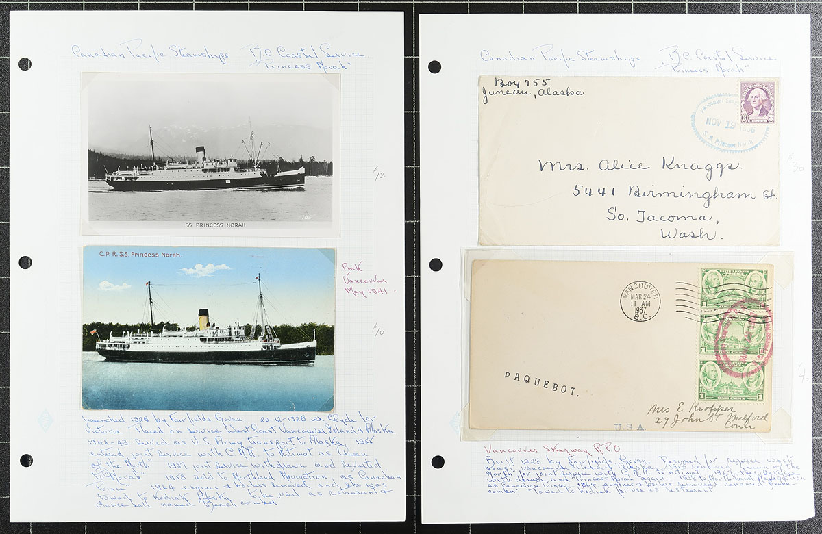 BC British Columbia Coastal Steamships. A collector's selection of a dozen pages, containing 15 picture postcards and 3 covers, all either showing / or carried on a BC Coastal Steamship operated by the Canadian Pacific Railway (CPR). Includes ships Princess Elizabeth, Princess Joan, Princess Norah, Princess of Alberni, Princess Kathleen, Princess Marguerite, Princess of Nanaimo and Princess Victoria. An interesting group, on hand-made pages with write-up. Estimate =