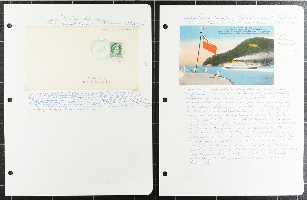 BC British Columbia Coastal Steamships. A collector's selection of a dozen pages, containing 15 picture postcards and 3 covers, all either showing / or carried on a BC Coastal Steamship operated by the Canadian Pacific Railway (CPR). Includes ships Princess Elizabeth, Princess Joan, Princess Norah, Princess of Alberni, Princess Kathleen, Princess Marguerite, Princess of Nanaimo and Princess Victoria. An interesting group, on hand-made pages with write-up. Estimate =