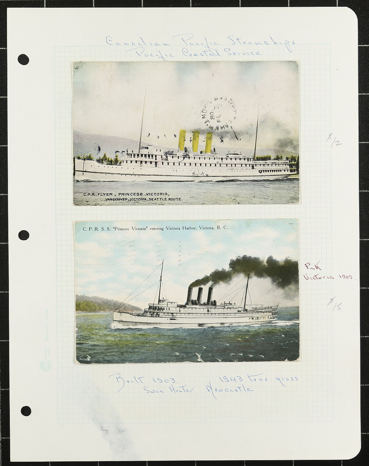 BC British Columbia Coastal Steamships. A collector's selection of a dozen pages, containing 15 picture postcards and 3 covers, all either showing / or carried on a BC Coastal Steamship operated by the Canadian Pacific Railway (CPR). Includes ships Princess Elizabeth, Princess Joan, Princess Norah, Princess of Alberni, Princess Kathleen, Princess Marguerite, Princess of Nanaimo and Princess Victoria. An interesting group, on hand-made pages with write-up. Estimate =