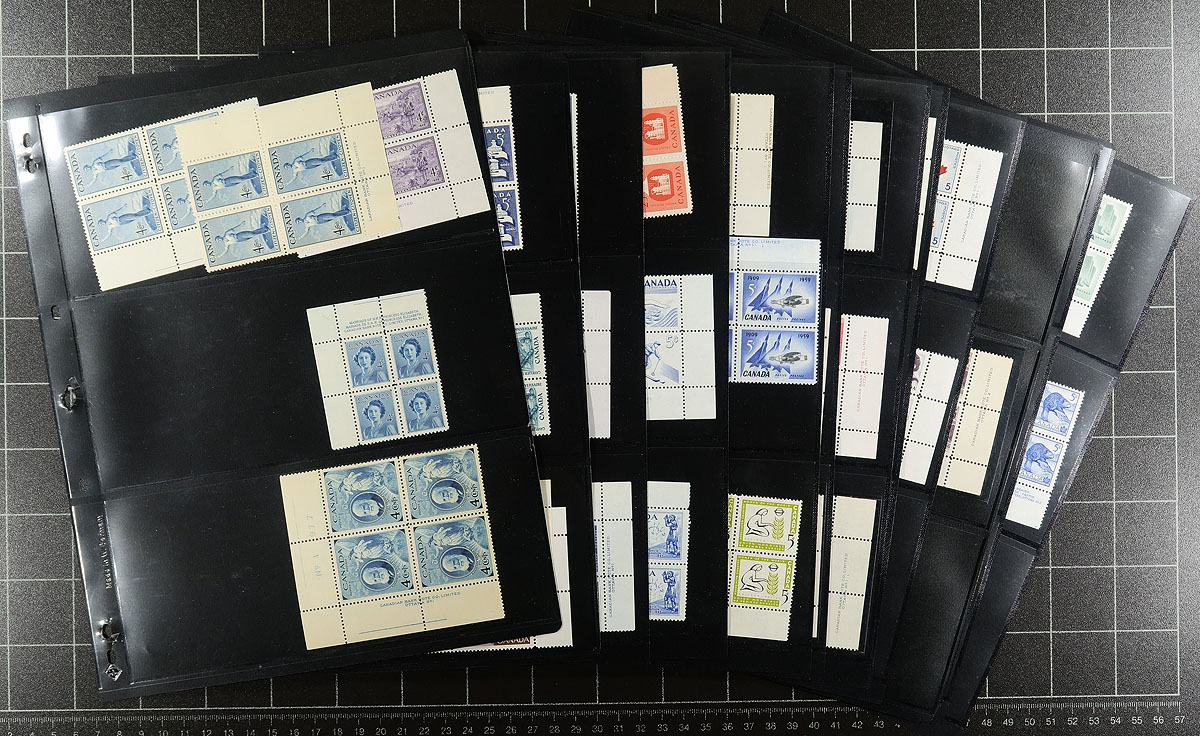 1940's / 1960's Plate Block Holding. An attractive selection of 187 mint plate blocks, all arranged in quasi-order on vario stockpages. A spot check showed most to be Never Hinged, but we see a few Lightly Hinged in the selvedge. Includes several better including QEII Centennials, 50c Textile, $1.00 Export, 20c Pulp and Paper, 25c Chemistry, 50c Oil Fields and $1.00 Fisheries (this last one LH in selvedge). Unchecked for any better paper florescence varieties. Estimate =