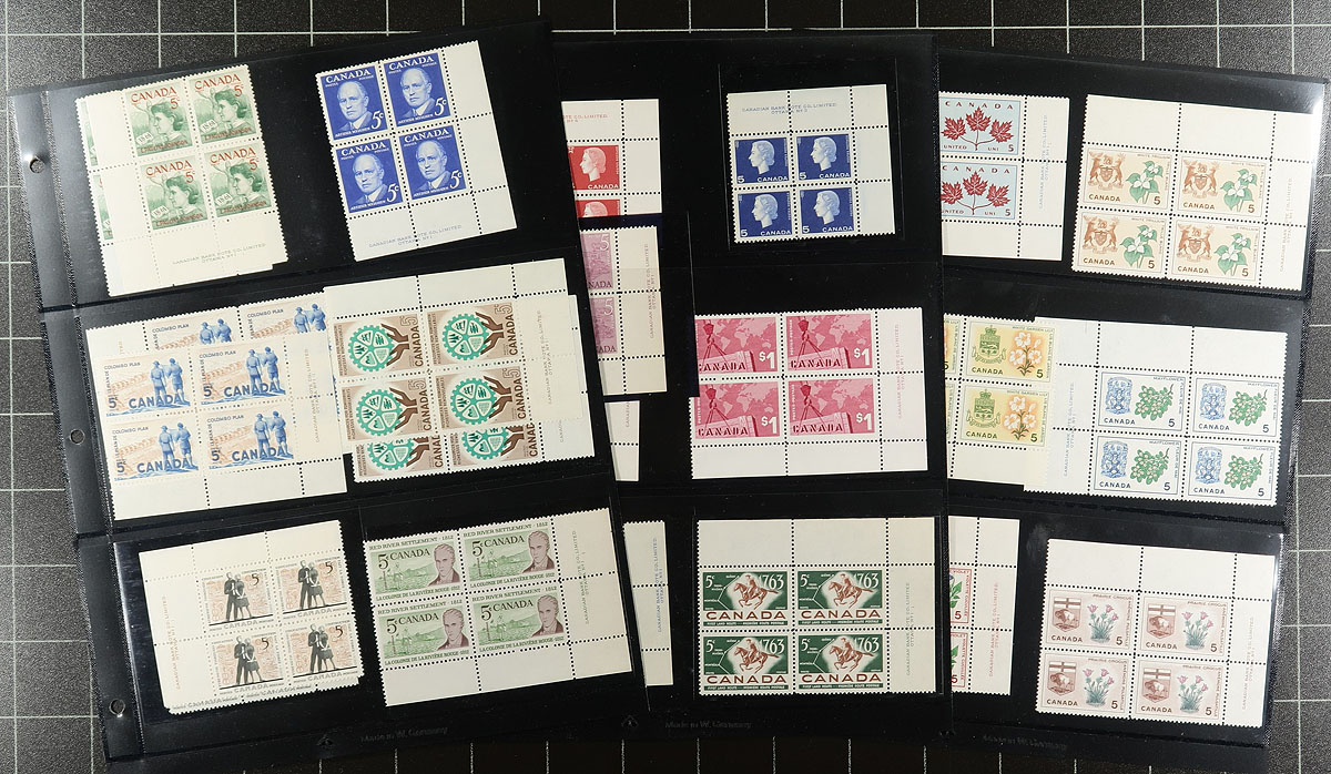 1940's / 1960's Plate Block Holding. An attractive selection of 187 mint plate blocks, all arranged in quasi-order on vario stockpages. A spot check showed most to be Never Hinged, but we see a few Lightly Hinged in the selvedge. Includes several better including QEII Centennials, 50c Textile, $1.00 Export, 20c Pulp and Paper, 25c Chemistry, 50c Oil Fields and $1.00 Fisheries (this last one LH in selvedge). Unchecked for any better paper florescence varieties. Estimate =