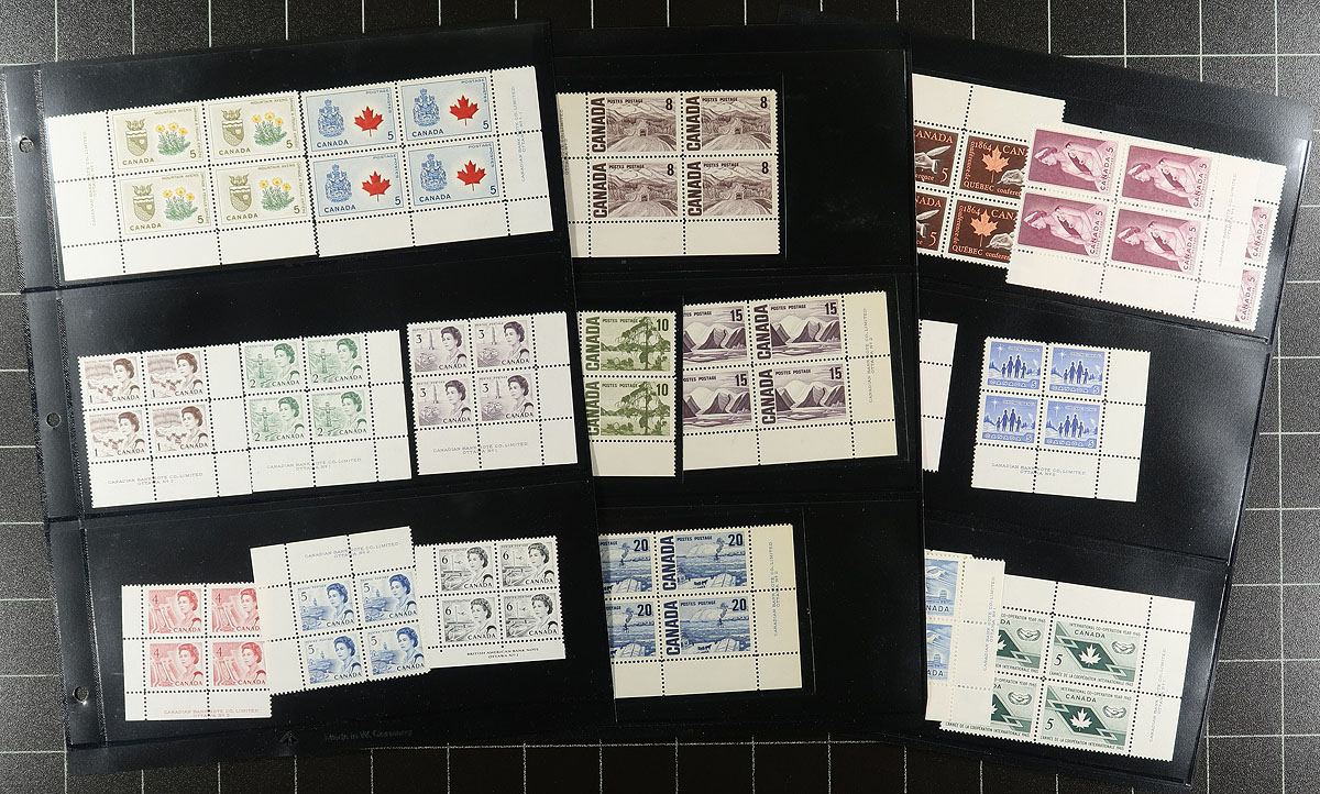 1940's / 1960's Plate Block Holding. An attractive selection of 187 mint plate blocks, all arranged in quasi-order on vario stockpages. A spot check showed most to be Never Hinged, but we see a few Lightly Hinged in the selvedge. Includes several better including QEII Centennials, 50c Textile, $1.00 Export, 20c Pulp and Paper, 25c Chemistry, 50c Oil Fields and $1.00 Fisheries (this last one LH in selvedge). Unchecked for any better paper florescence varieties. Estimate =