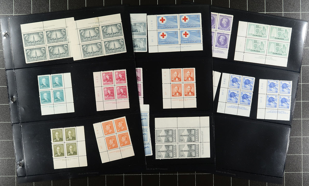 1940's / 1960's Plate Block Holding. An attractive selection of 187 mint plate blocks, all arranged in quasi-order on vario stockpages. A spot check showed most to be Never Hinged, but we see a few Lightly Hinged in the selvedge. Includes several better including QEII Centennials, 50c Textile, $1.00 Export, 20c Pulp and Paper, 25c Chemistry, 50c Oil Fields and $1.00 Fisheries (this last one LH in selvedge). Unchecked for any better paper florescence varieties. Estimate =