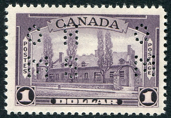 VF mint Never Hinged example of the 4-hole "O.H.M.S." official perfin on the Aniline Ink variety of the 1938 issue $1.00 Chateau Ramezay. A lovely stamp with intense colour. 2025-2026 Unitrade =