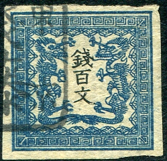 VF used example of the 1871 issued, 100m blue "Dragons" stamp (Plate 2). Deep colour and attractive postmark. 2025 Scott US$550.00 =