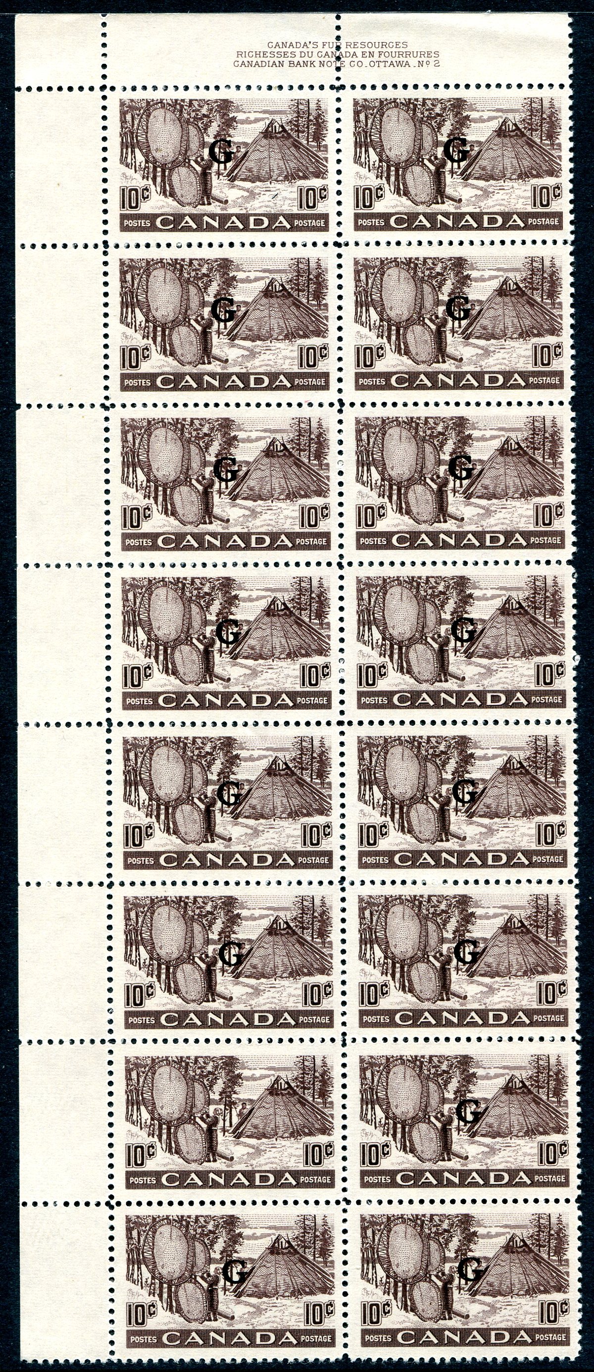 VF mint Never Hinged UL Plate No.2 / Sheet-Margin block of 16 of the 1950 issue 10c Fur Trade, G official overprint, with missing the "G" in position. A showpiece example of this sought-after error, undervalued in the catalogue compared to how seldom we see these offered. Valued as a VFNH pair (as listed in Unitrade), but certainly worth more in a sheet margin / plate block. 2025-2026 Unitrade =