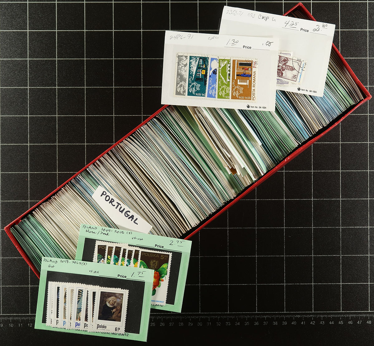 Stock in 6x Red Dealer Boxes - Isreal to Romania (picking up from 6 red boxes in our previous bidboard). An enticing offering of 6 dealer "102" card boxes, all over-stuffed with a wide range of mint and used material, in mostly identified singles and sets. Values up to $10.00 per card, with the owner estimated that the average value is $1.00 per card, but with there being about 4,000 cards in total! Lots of value here for the collector or dealer. Estimate =