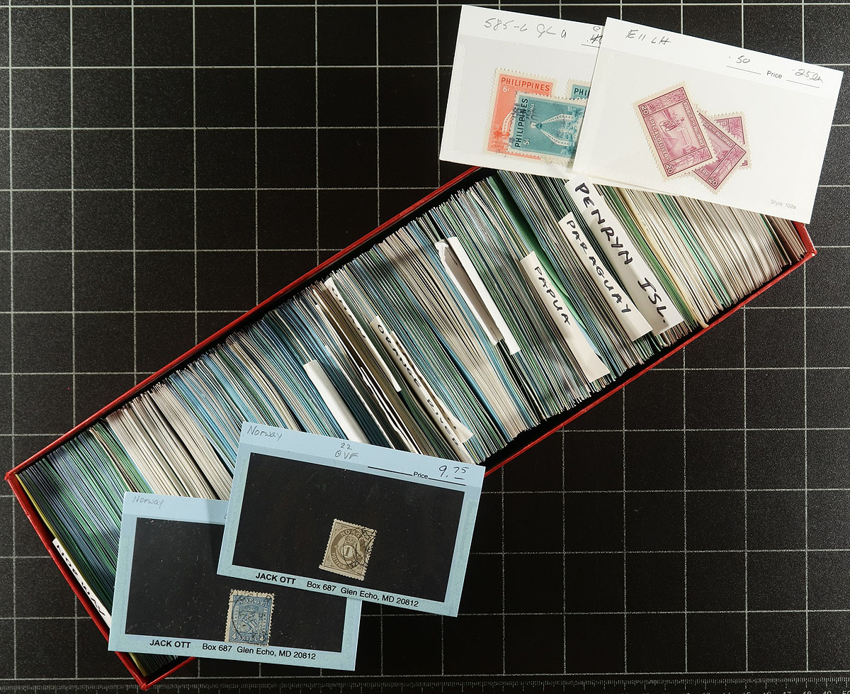 Stock in 6x Red Dealer Boxes - Isreal to Romania (picking up from 6 red boxes in our previous bidboard). An enticing offering of 6 dealer "102" card boxes, all over-stuffed with a wide range of mint and used material, in mostly identified singles and sets. Values up to $10.00 per card, with the owner estimated that the average value is $1.00 per card, but with there being about 4,000 cards in total! Lots of value here for the collector or dealer. Estimate =