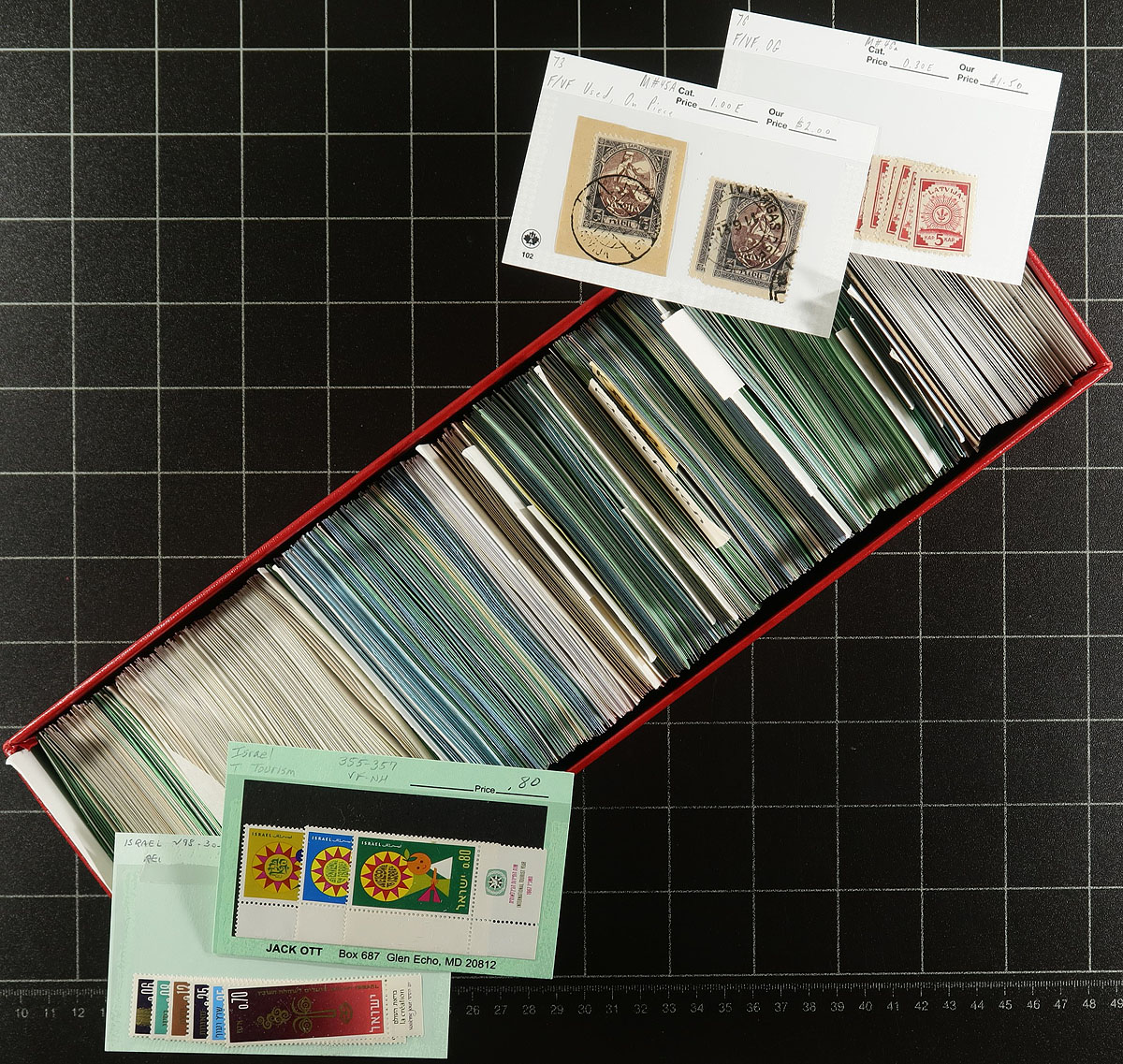 Stock in 6x Red Dealer Boxes - Isreal to Romania (picking up from 6 red boxes in our previous bidboard). An enticing offering of 6 dealer "102" card boxes, all over-stuffed with a wide range of mint and used material, in mostly identified singles and sets. Values up to $10.00 per card, with the owner estimated that the average value is $1.00 per card, but with there being about 4,000 cards in total! Lots of value here for the collector or dealer. Estimate =