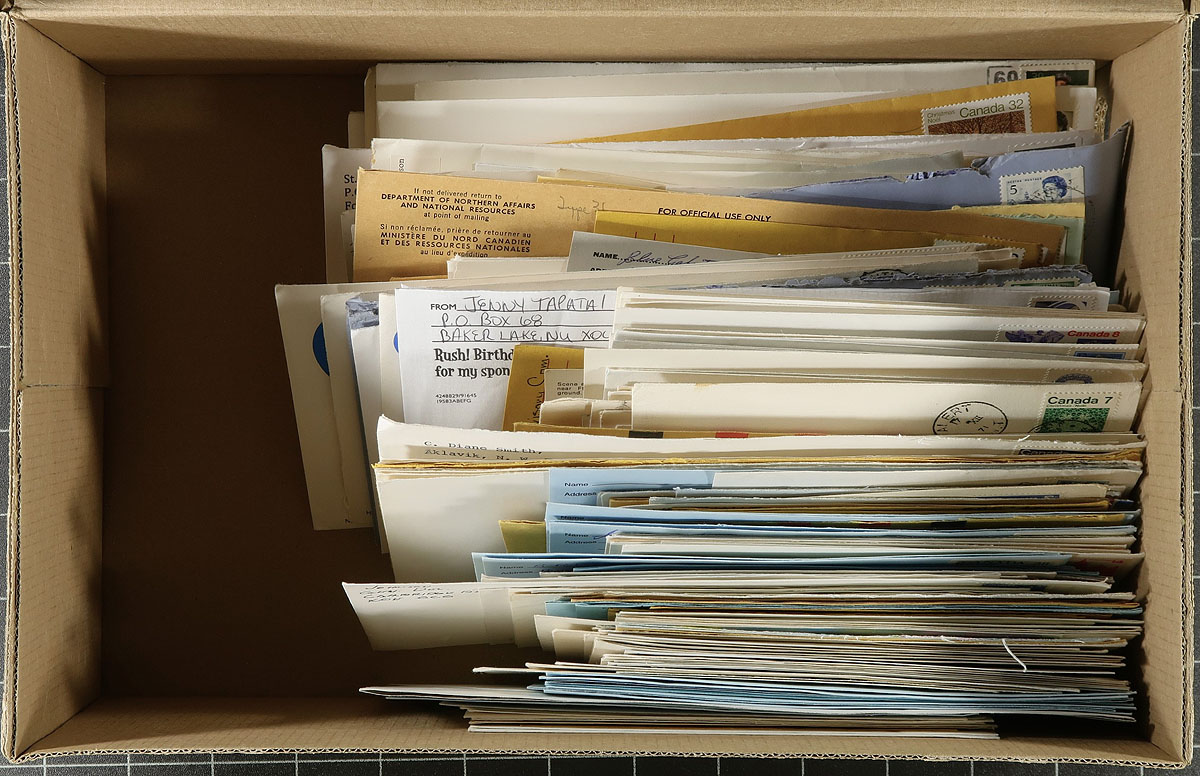 Accumulation of roughly 300 covers collected for Northwest Territories town cancels, 1930's-1980's. We note a handful of different towns including Coppermine, Arctic Bay, Hay River, Fort Smith, Cape Dorset, and more. Postmark interest includes cds, MOON, POCON types, machine, Klussendorf, and perhaps a few others, with the vast majority of covers commercial in nature including envelopes having corner advertising. A few faults as is the nature of commercial mail, still a nice lot for Canada postmark hunter. Estimate =
