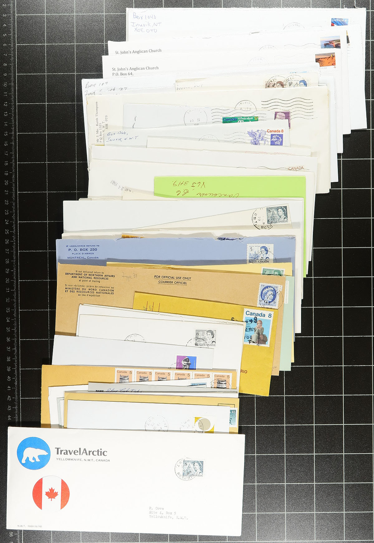 Accumulation of roughly 300 covers collected for Northwest Territories town cancels, 1930's-1980's. We note a handful of different towns including Coppermine, Arctic Bay, Hay River, Fort Smith, Cape Dorset, and more. Postmark interest includes cds, MOON, POCON types, machine, Klussendorf, and perhaps a few others, with the vast majority of covers commercial in nature including envelopes having corner advertising. A few faults as is the nature of commercial mail, still a nice lot for Canada postmark hunter. Estimate =