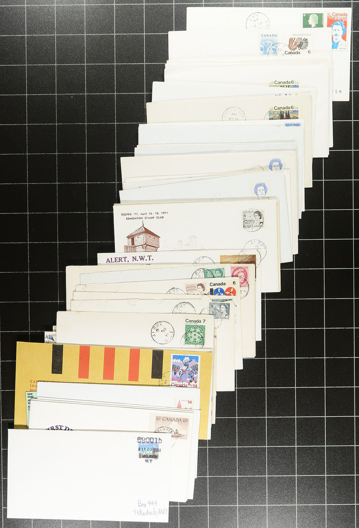 Accumulation of roughly 300 covers collected for Northwest Territories town cancels, 1930's-1980's. We note a handful of different towns including Coppermine, Arctic Bay, Hay River, Fort Smith, Cape Dorset, and more. Postmark interest includes cds, MOON, POCON types, machine, Klussendorf, and perhaps a few others, with the vast majority of covers commercial in nature including envelopes having corner advertising. A few faults as is the nature of commercial mail, still a nice lot for Canada postmark hunter. Estimate =