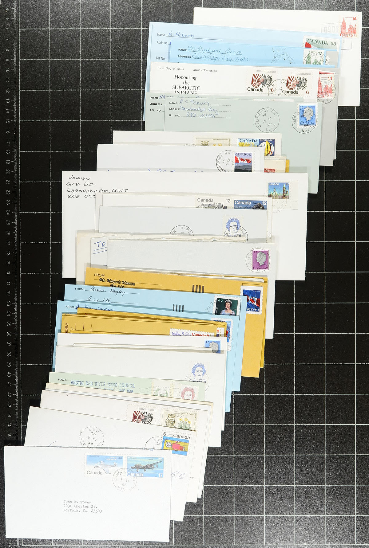 Accumulation of roughly 300 covers collected for Northwest Territories town cancels, 1930's-1980's. We note a handful of different towns including Coppermine, Arctic Bay, Hay River, Fort Smith, Cape Dorset, and more. Postmark interest includes cds, MOON, POCON types, machine, Klussendorf, and perhaps a few others, with the vast majority of covers commercial in nature including envelopes having corner advertising. A few faults as is the nature of commercial mail, still a nice lot for Canada postmark hunter. Estimate =