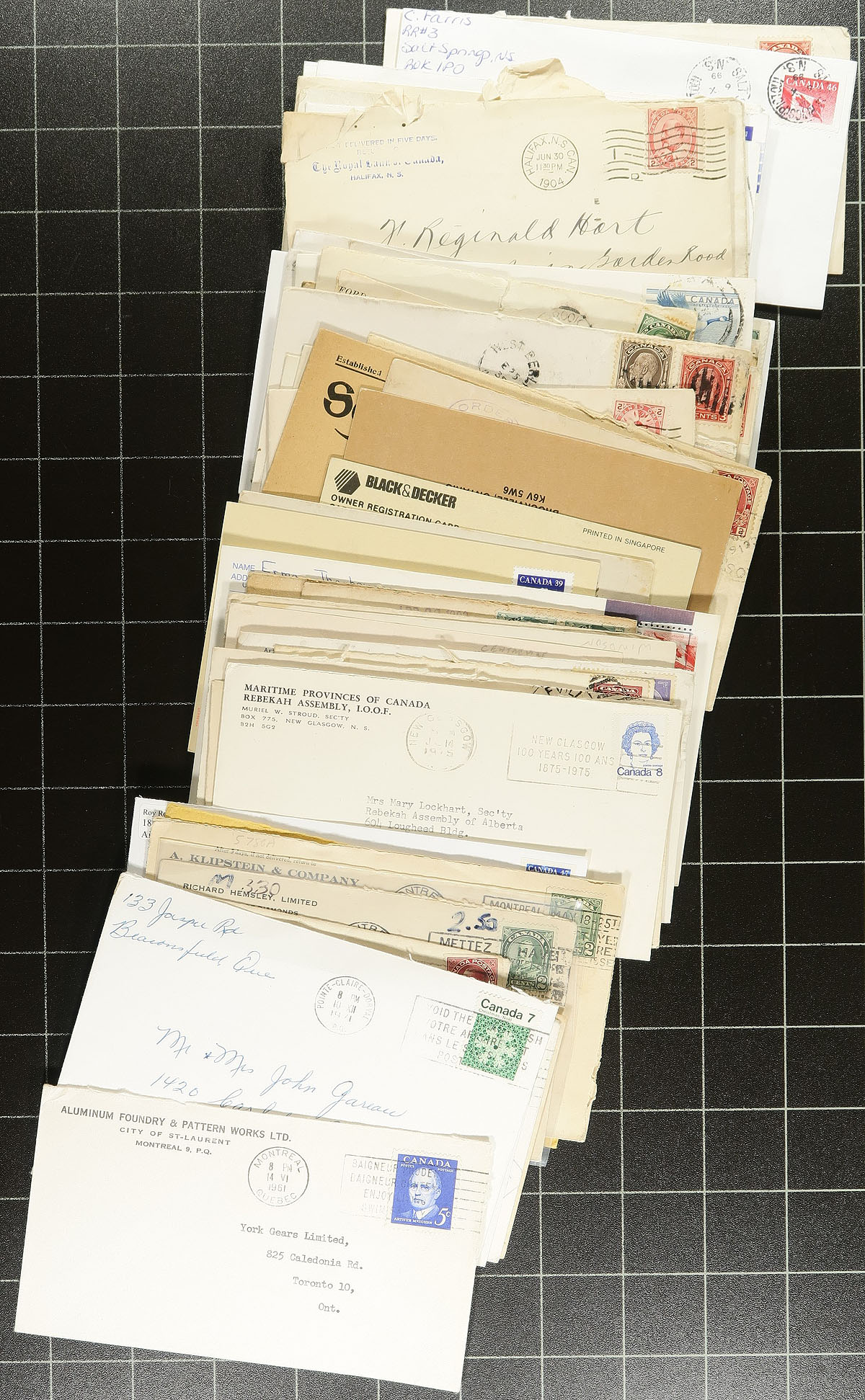 Large accumulation of Canada of covers filling a carton, Victorian to modern era. A cursory check indicated a wide variety of items including postal stationery, postcards, first day covers, parcel mail, and more. Most of the mail appears to be commercial in nature from from correspondence, including post 2020 commemorative frankings, along with Northwest Territory town postmarks, and from other Provinces, noting cds, squared circle, duplex, POCON, and other cancel types. The lot also includes loose stamps on piece collected for town postmarks. A nice project for the Canada collector. Estimate =