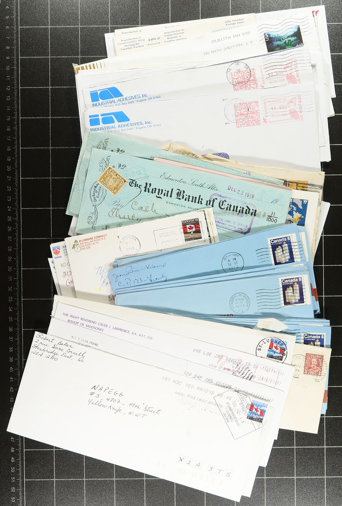 Large accumulation of Canada of covers filling a carton, Victorian to modern era. A cursory check indicated a wide variety of items including postal stationery, postcards, first day covers, parcel mail, and more. Most of the mail appears to be commercial in nature from from correspondence, including post 2020 commemorative frankings, along with Northwest Territory town postmarks, and from other Provinces, noting cds, squared circle, duplex, POCON, and other cancel types. The lot also includes loose stamps on piece collected for town postmarks. A nice project for the Canada collector. Estimate =