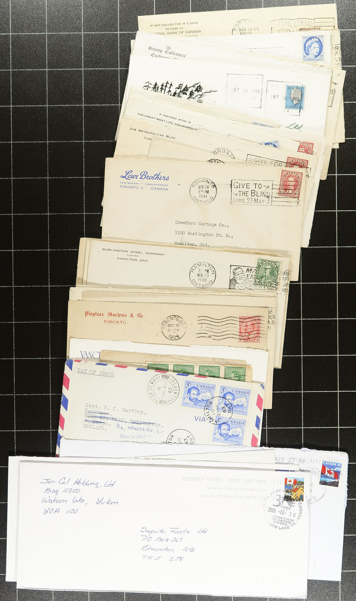 Large accumulation of Canada of covers filling a carton, Victorian to modern era. A cursory check indicated a wide variety of items including postal stationery, postcards, first day covers, parcel mail, and more. Most of the mail appears to be commercial in nature from from correspondence, including post 2020 commemorative frankings, along with Northwest Territory town postmarks, and from other Provinces, noting cds, squared circle, duplex, POCON, and other cancel types. The lot also includes loose stamps on piece collected for town postmarks. A nice project for the Canada collector. Estimate =