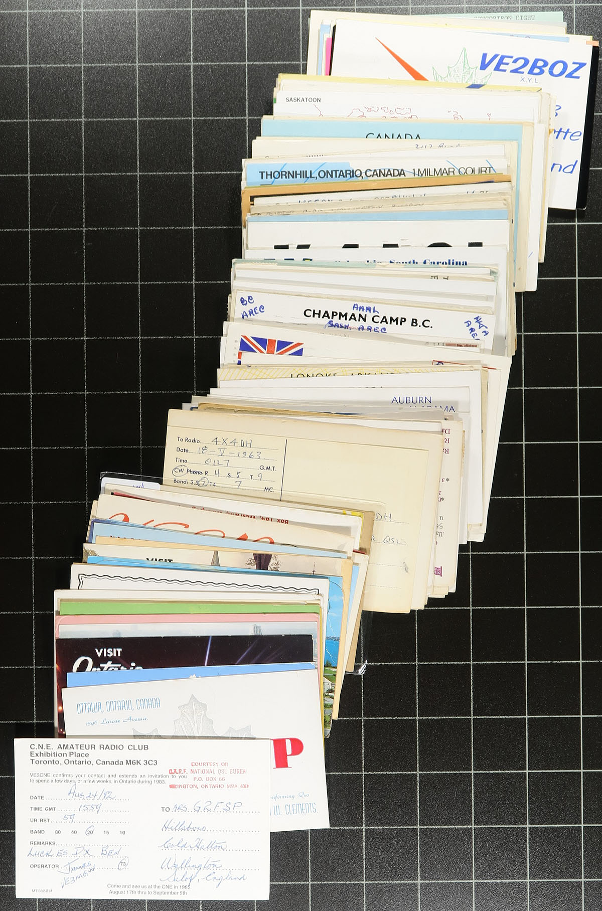 Accumulation of worldwide covers and cards in a bankers box. A quick look revealed better representation from the United States, with most material ranging from the 1940's to modern day, including roughly 100 United States military covers (several A.P.O. postmarks, including from the Arctic area, Navy and Army censor postmarks and more), roughly 150 worldwide cards with amateur radio call letters and numbers, along with first day covers, and more. Most of the commercial mail is from a correspondence, generally from the United States, Singapore, and a few other locations. A nice lot for the worldwide collector. Estimate =