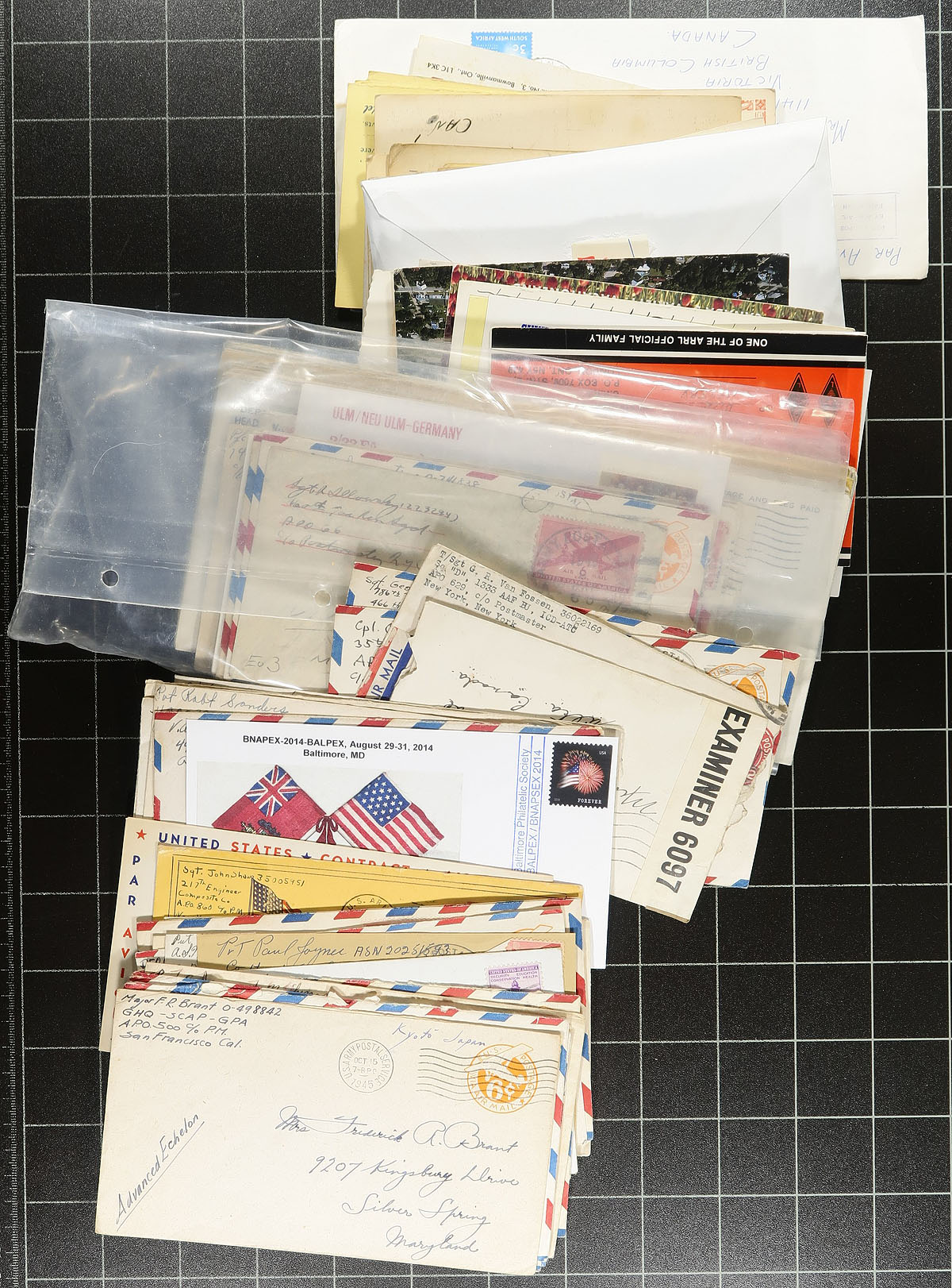 Accumulation of worldwide covers and cards in a bankers box. A quick look revealed better representation from the United States, with most material ranging from the 1940's to modern day, including roughly 100 United States military covers (several A.P.O. postmarks, including from the Arctic area, Navy and Army censor postmarks and more), roughly 150 worldwide cards with amateur radio call letters and numbers, along with first day covers, and more. Most of the commercial mail is from a correspondence, generally from the United States, Singapore, and a few other locations. A nice lot for the worldwide collector. Estimate =