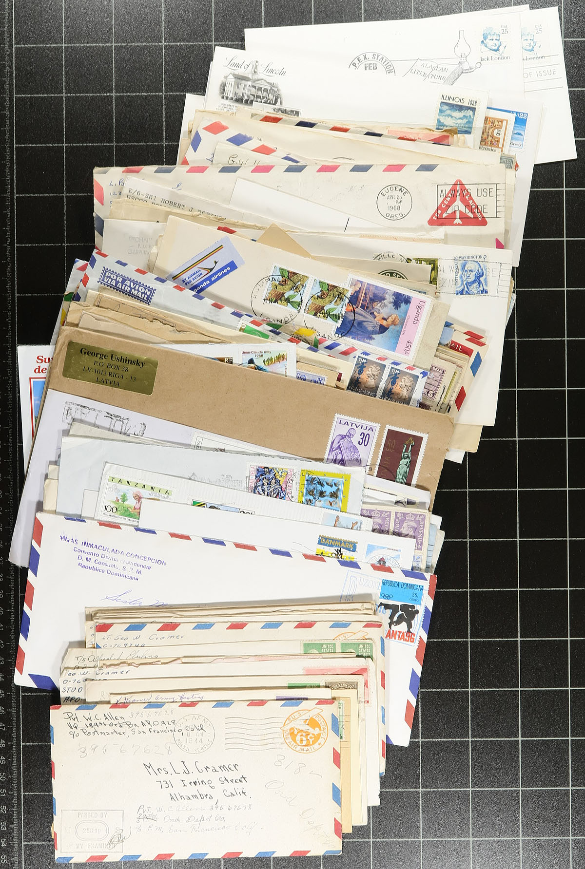 Accumulation of worldwide covers and cards in a bankers box. A quick look revealed better representation from the United States, with most material ranging from the 1940's to modern day, including roughly 100 United States military covers (several A.P.O. postmarks, including from the Arctic area, Navy and Army censor postmarks and more), roughly 150 worldwide cards with amateur radio call letters and numbers, along with first day covers, and more. Most of the commercial mail is from a correspondence, generally from the United States, Singapore, and a few other locations. A nice lot for the worldwide collector. Estimate =