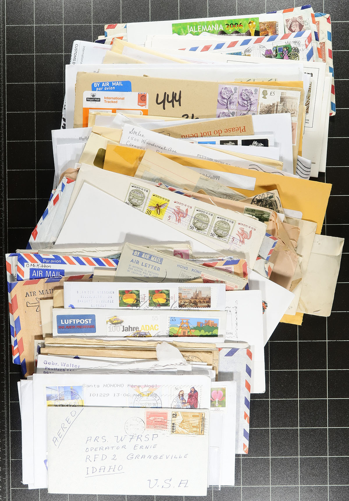 Accumulation of worldwide covers and cards in a bankers box. A quick look revealed better representation from the United States, with most material ranging from the 1940's to modern day, including roughly 100 United States military covers (several A.P.O. postmarks, including from the Arctic area, Navy and Army censor postmarks and more), roughly 150 worldwide cards with amateur radio call letters and numbers, along with first day covers, and more. Most of the commercial mail is from a correspondence, generally from the United States, Singapore, and a few other locations. A nice lot for the worldwide collector. Estimate =