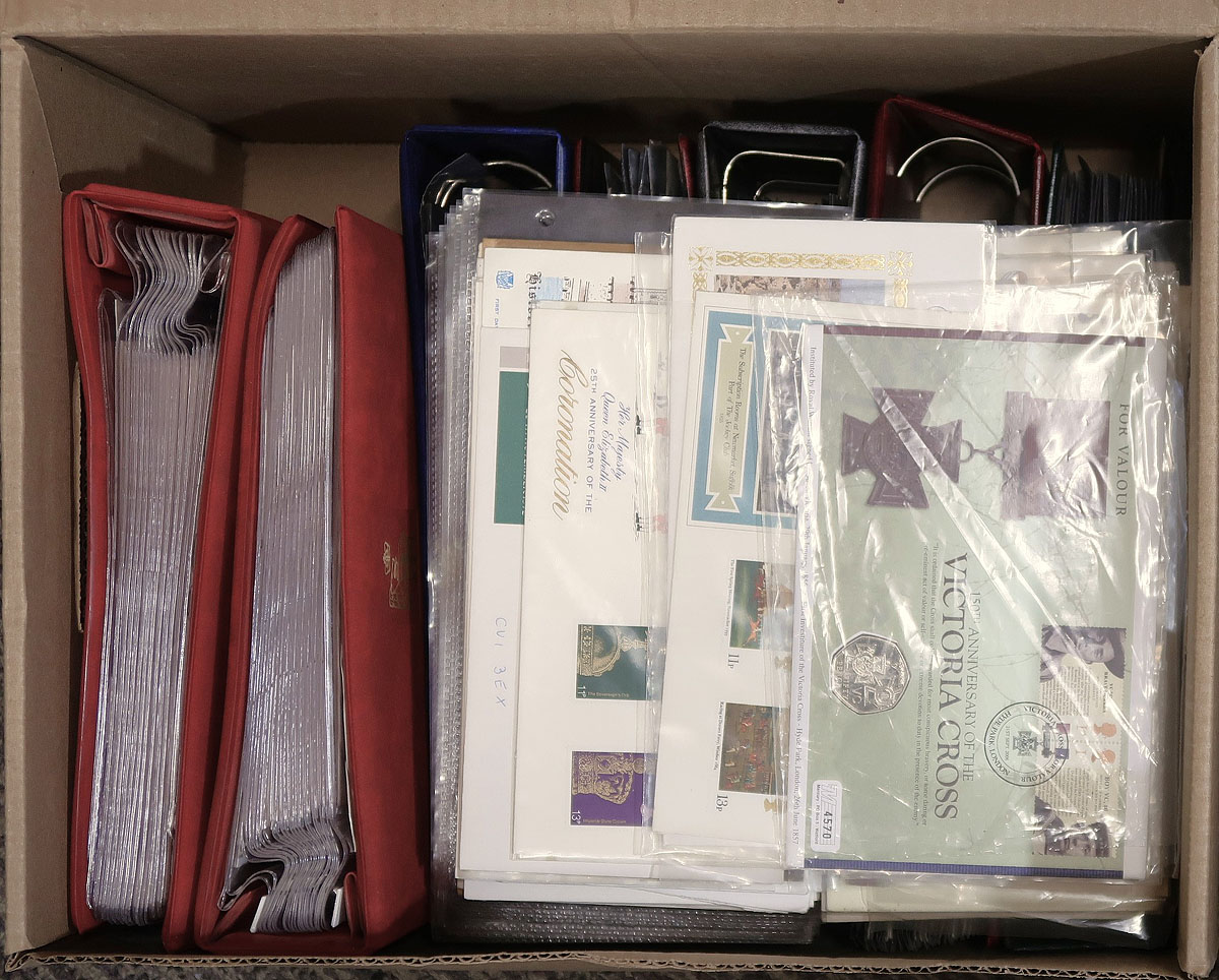 Covers Holding. A collection of roughly 350 first day covers, 1970-1990's, in 7 cover albums and with loose material. The collection contains singles and sets frankings, with roughly 120 Great Britain covers in 2 Westminster Collectors Society albums (and loose material), along with covers from Jersey and Guernsey in the remaining 5 albums. A nice clean lot for collectors and dealers alike. Estimate =