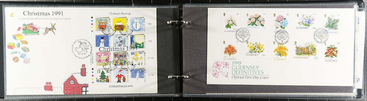 Covers Holding. A collection of roughly 350 first day covers, 1970-1990's, in 7 cover albums and with loose material. The collection contains singles and sets frankings, with roughly 120 Great Britain covers in 2 Westminster Collectors Society albums (and loose material), along with covers from Jersey and Guernsey in the remaining 5 albums. A nice clean lot for collectors and dealers alike. Estimate =