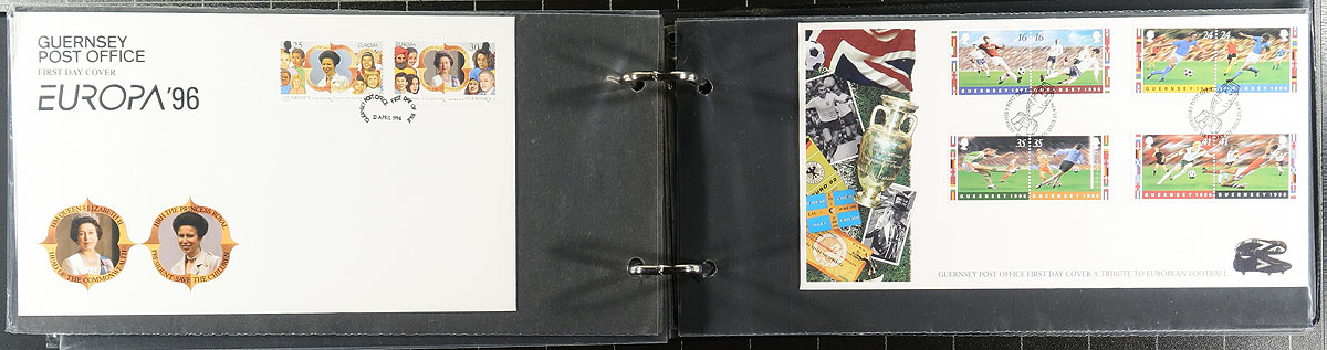 Covers Holding. A collection of roughly 350 first day covers, 1970-1990's, in 7 cover albums and with loose material. The collection contains singles and sets frankings, with roughly 120 Great Britain covers in 2 Westminster Collectors Society albums (and loose material), along with covers from Jersey and Guernsey in the remaining 5 albums. A nice clean lot for collectors and dealers alike. Estimate =