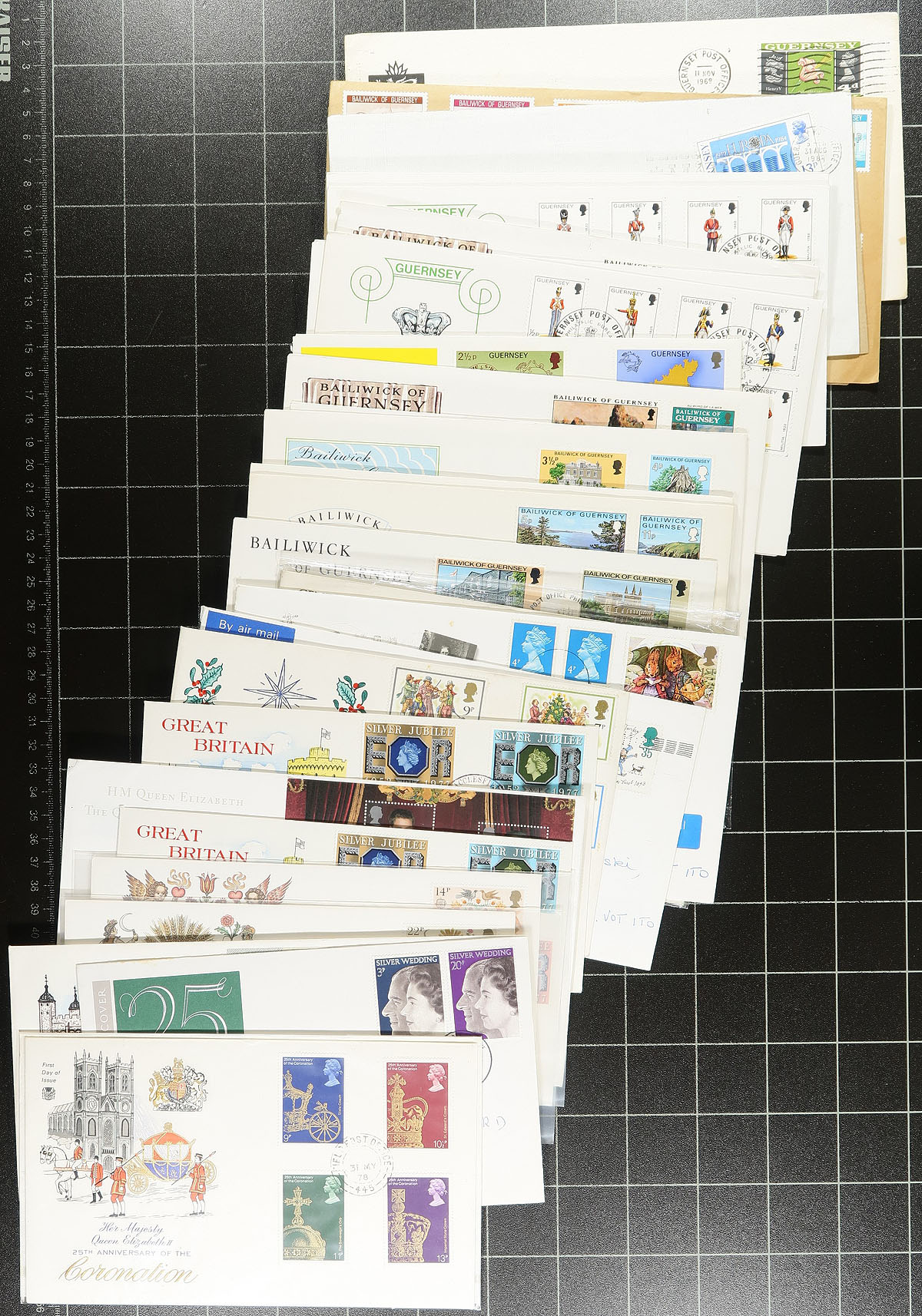 Covers Holding. A collection of roughly 350 first day covers, 1970-1990's, in 7 cover albums and with loose material. The collection contains singles and sets frankings, with roughly 120 Great Britain covers in 2 Westminster Collectors Society albums (and loose material), along with covers from Jersey and Guernsey in the remaining 5 albums. A nice clean lot for collectors and dealers alike. Estimate =