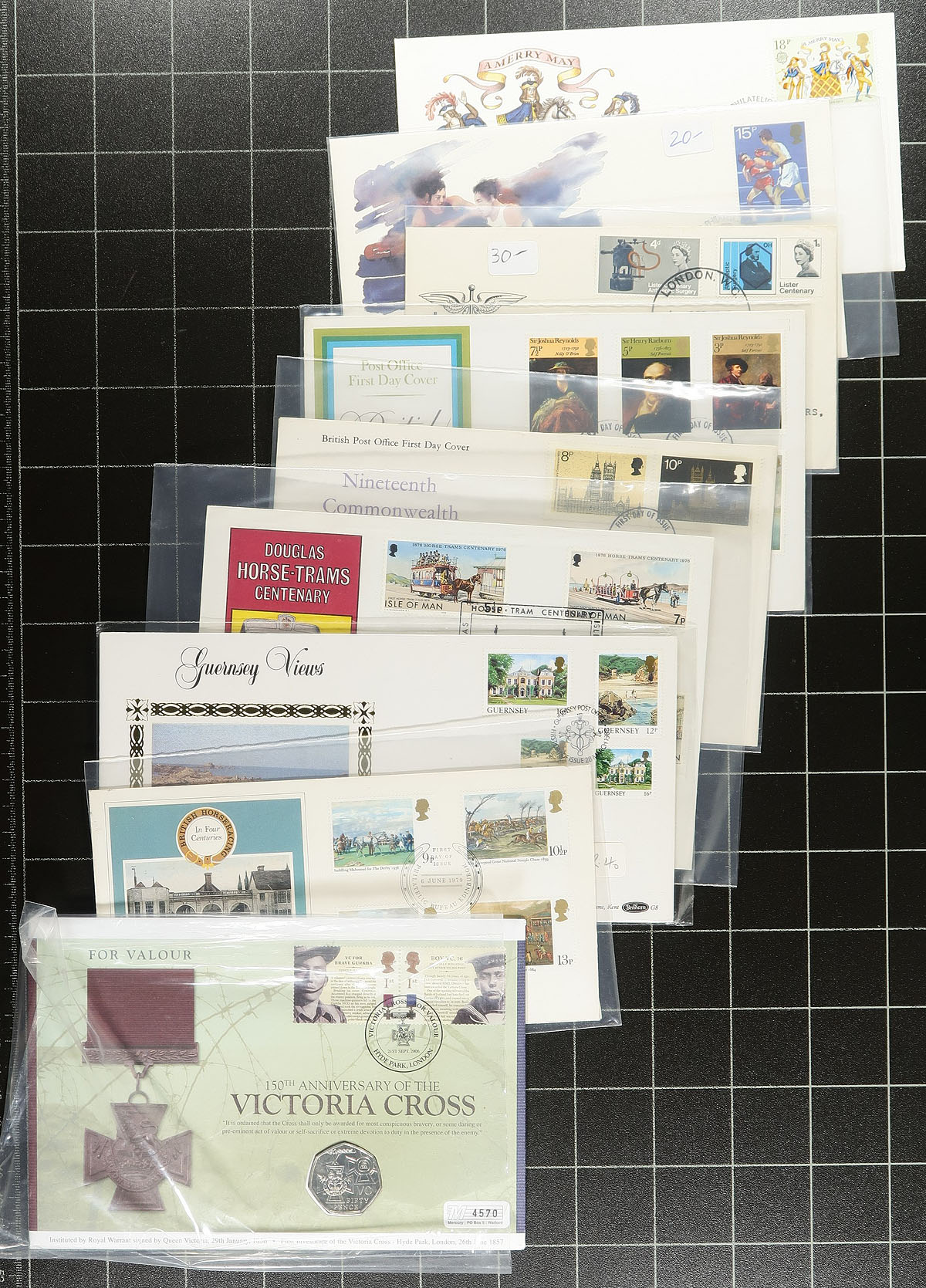 Covers Holding. A collection of roughly 350 first day covers, 1970-1990's, in 7 cover albums and with loose material. The collection contains singles and sets frankings, with roughly 120 Great Britain covers in 2 Westminster Collectors Society albums (and loose material), along with covers from Jersey and Guernsey in the remaining 5 albums. A nice clean lot for collectors and dealers alike. Estimate =