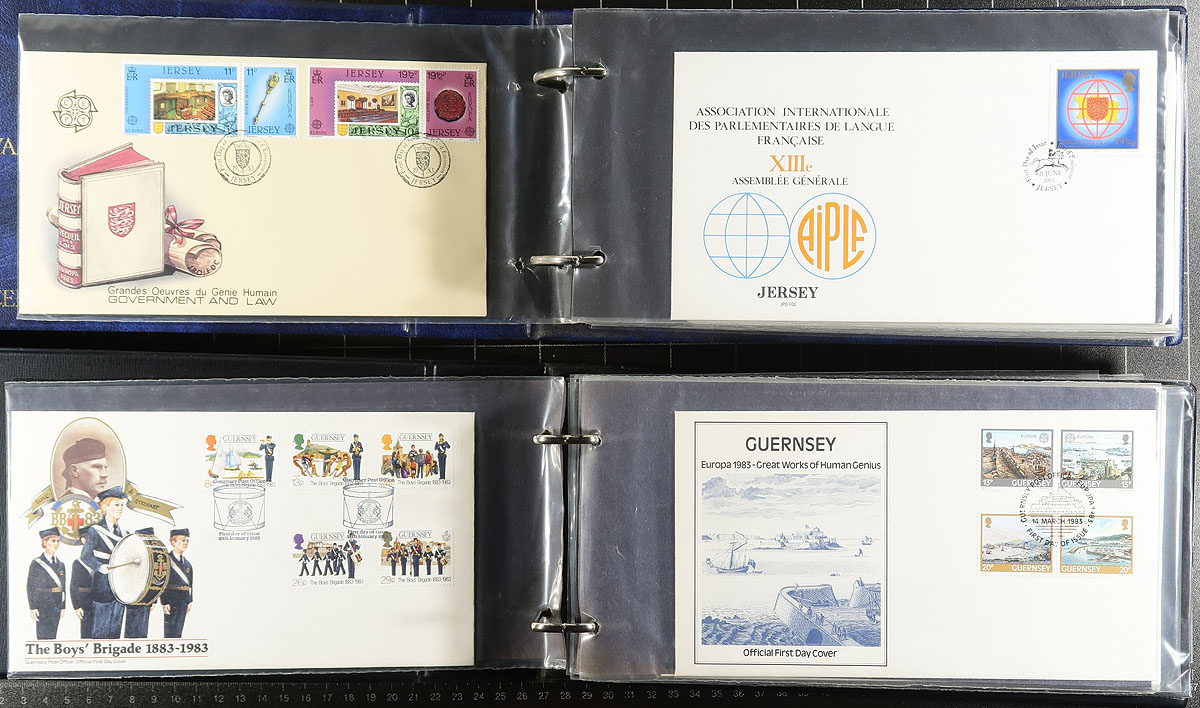 Covers Holding. A collection of roughly 350 first day covers, 1970-1990's, in 7 cover albums and with loose material. The collection contains singles and sets frankings, with roughly 120 Great Britain covers in 2 Westminster Collectors Society albums (and loose material), along with covers from Jersey and Guernsey in the remaining 5 albums. A nice clean lot for collectors and dealers alike. Estimate =