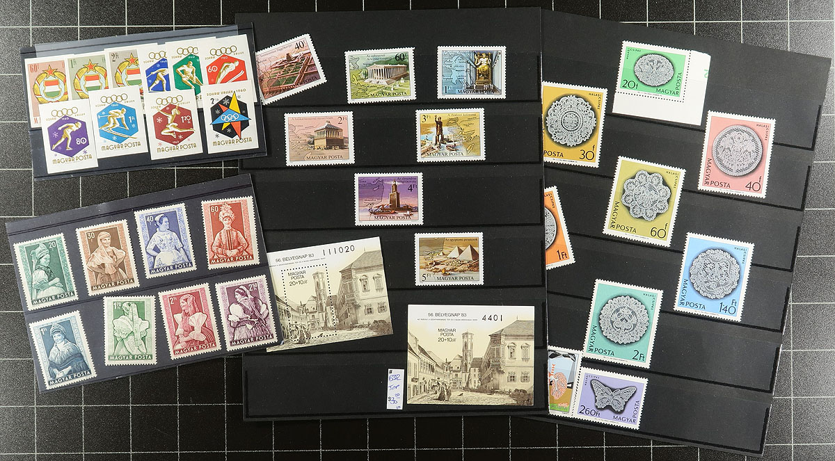 Accumulation of primarily mint Hungary items, 1940's-1980's, containing many hundreds of stamps in a springback album, stock pages, and glassines. A spot check indicated singles, sets, several souvenir sheets, and back of the book items, with some material cataloging $10 and up, including Scott #B18-B34 (mh, c.v. $98.90 total). Most of the material has been catalogued using an older Scott catalogue totaling US$489.00, leaving potential finds to the dedicated collector. A nice start to a mint Hungary collection, noting many topical and thematic possibilities, overall very fine. Estimate =