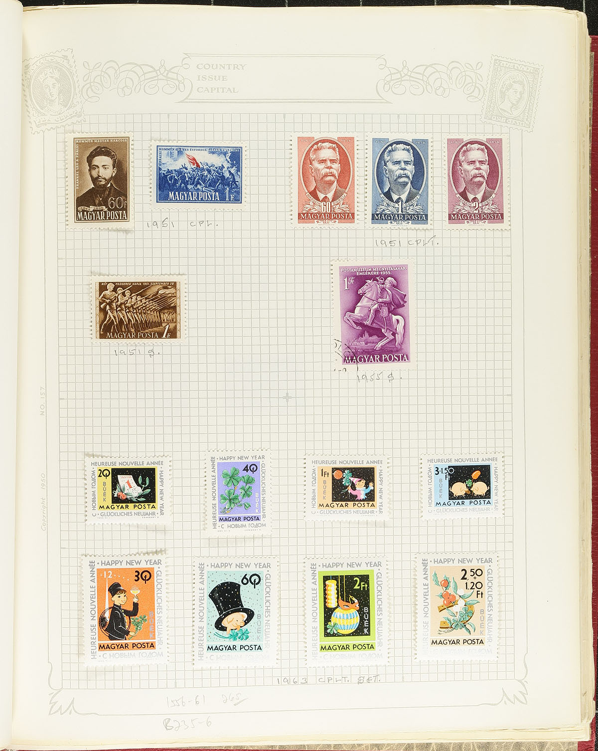 Accumulation of primarily mint Hungary items, 1940's-1980's, containing many hundreds of stamps in a springback album, stock pages, and glassines. A spot check indicated singles, sets, several souvenir sheets, and back of the book items, with some material cataloging $10 and up, including Scott #B18-B34 (mh, c.v. $98.90 total). Most of the material has been catalogued using an older Scott catalogue totaling US$489.00, leaving potential finds to the dedicated collector. A nice start to a mint Hungary collection, noting many topical and thematic possibilities, overall very fine. Estimate =