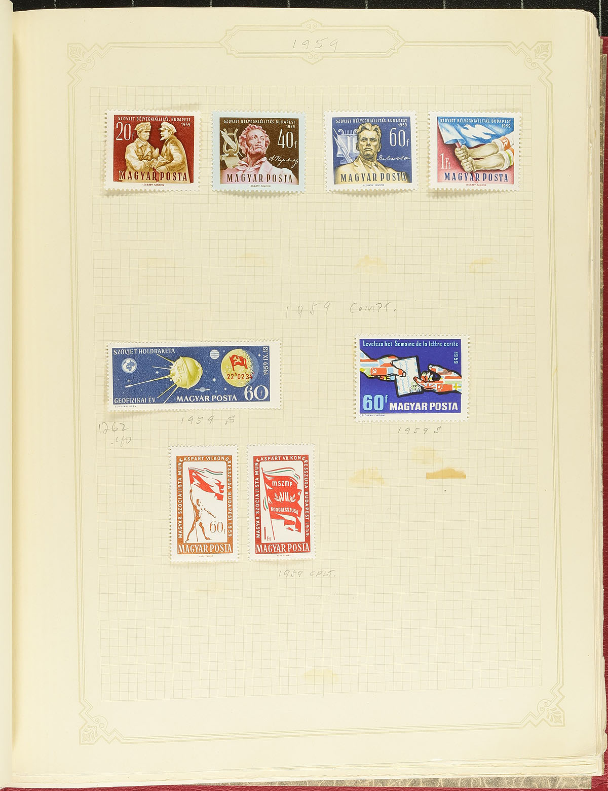 Accumulation of primarily mint Hungary items, 1940's-1980's, containing many hundreds of stamps in a springback album, stock pages, and glassines. A spot check indicated singles, sets, several souvenir sheets, and back of the book items, with some material cataloging $10 and up, including Scott #B18-B34 (mh, c.v. $98.90 total). Most of the material has been catalogued using an older Scott catalogue totaling US$489.00, leaving potential finds to the dedicated collector. A nice start to a mint Hungary collection, noting many topical and thematic possibilities, overall very fine. Estimate =