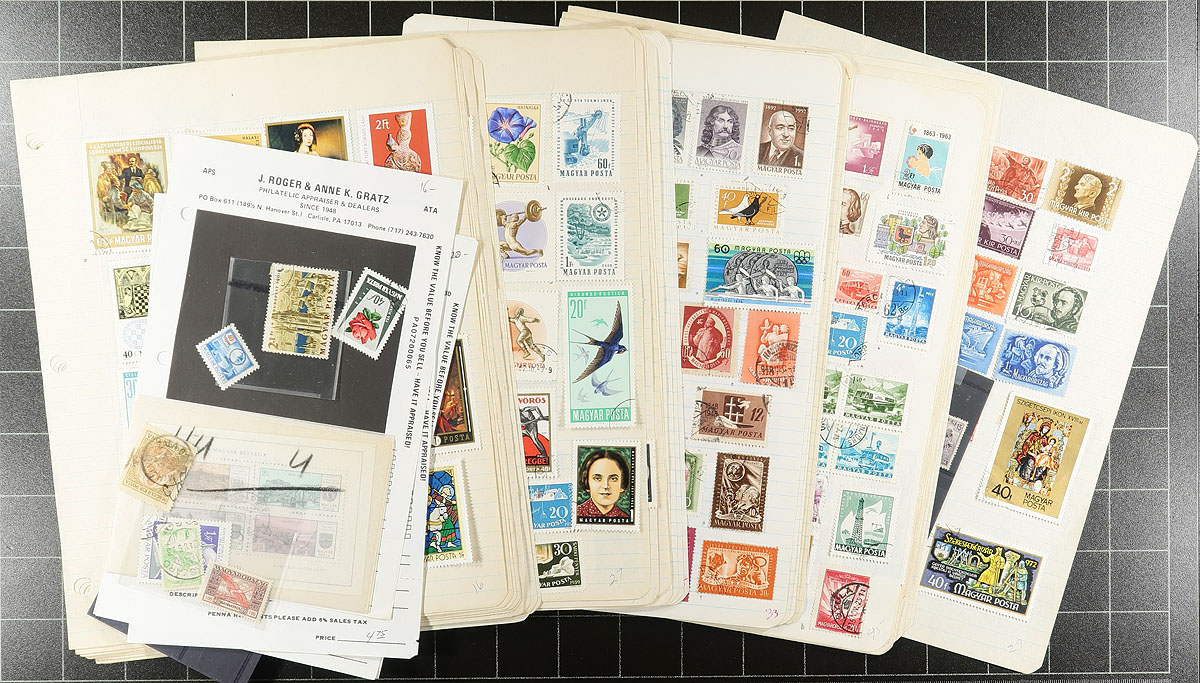 Large accumulation of used Hungary, 1870's-1980's, containing many thousands of stamps in a stockbook and album, along with many album and stock pages. A cursory check indicated material ranging from Scott #9/3140, with singles, sets, souvenir sheets, and back of the book stamps, with a few items cataloguing in the $5 to $10 range. Owner's 2016 catalogue value for a portion of the lot totals US$546.00, leaving finds, including town postmark types to the dedicated collector. A nice lot for the Hungary or worldwide collector, overall fine to very fine. Estimate =