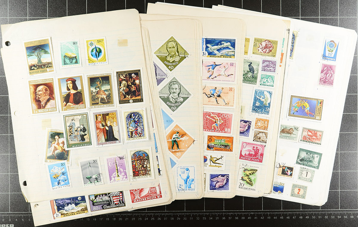 Large accumulation of used Hungary, 1870's-1980's, containing many thousands of stamps in a stockbook and album, along with many album and stock pages. A cursory check indicated material ranging from Scott #9/3140, with singles, sets, souvenir sheets, and back of the book stamps, with a few items cataloguing in the $5 to $10 range. Owner's 2016 catalogue value for a portion of the lot totals US$546.00, leaving finds, including town postmark types to the dedicated collector. A nice lot for the Hungary or worldwide collector, overall fine to very fine. Estimate =