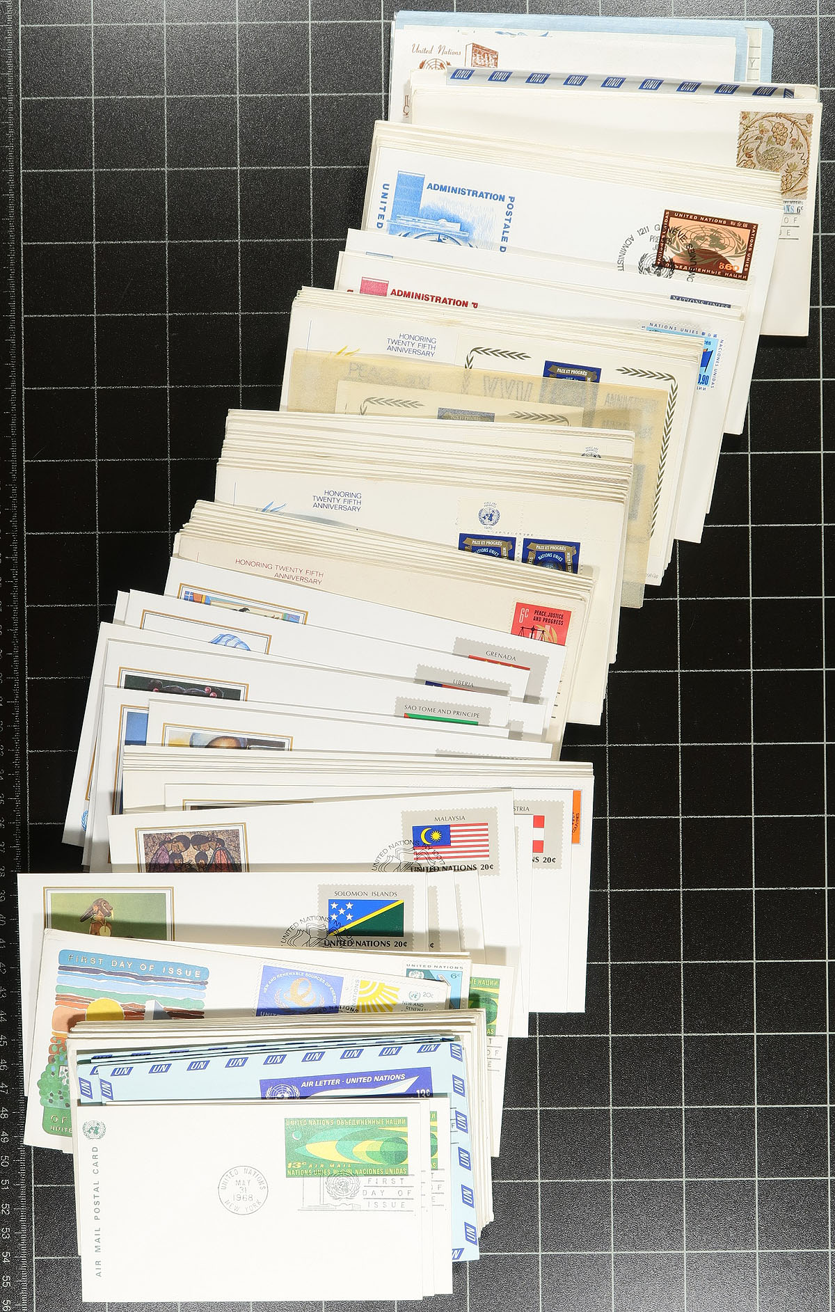 Accumulation of roughly 750 United Nations first day cover, 1950's-1980's, filling a bankers box. We note singles, sets, and souvenir sheet frankings, with a few having private cachets, along with large sized Unicef cover set in several large folders, flag series, postal stationery, aerogrammes, and more. A nice lot for topical and thematic collectors, with duplication up to 5 for a few issues. Estimate =