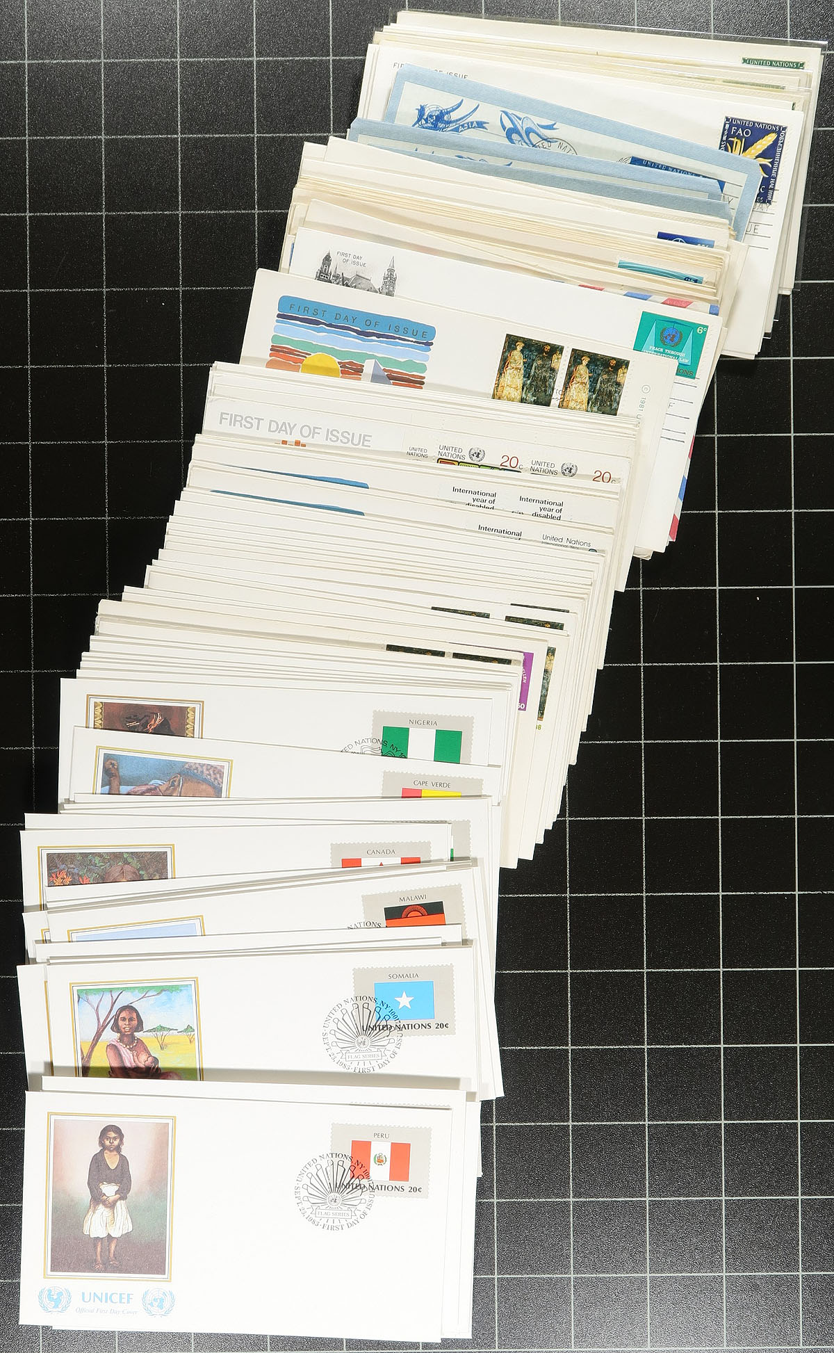 Accumulation of roughly 750 United Nations first day cover, 1950's-1980's, filling a bankers box. We note singles, sets, and souvenir sheet frankings, with a few having private cachets, along with large sized Unicef cover set in several large folders, flag series, postal stationery, aerogrammes, and more. A nice lot for topical and thematic collectors, with duplication up to 5 for a few issues. Estimate =
