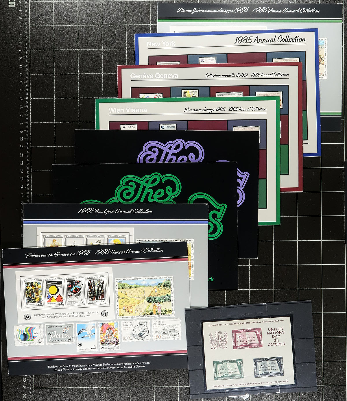 Collection / accumulation of primarily never hinged United Nations, 1950's-2000's, containing over 1,000 stamps in 2 albums, stock pages, and glassines. We note an almost complete collection of New York and Geneva in two Lighthouse Luxus DL springback albums with hingeless pages ranging from 1951 to 1981, along with a stockbook with singles and sheets from the 1960s to the 1980s, a binder of "Flag" series sheetlets, a few presentation and annual collections, and more. A view of catalogue values indicate some items cataloguing $10 and up, including Scott #38 souvenir sheet (nh, c.v. $50). Owner's 2014 Scott catalogue value for the lot totals US$818.00 ($1104.30 CDN). A nice lot for collectors and dealers alike. Estimate =