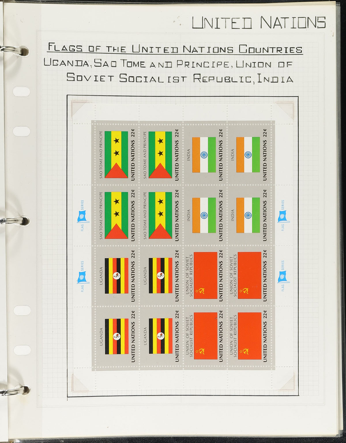 Collection / accumulation of primarily never hinged United Nations, 1950's-2000's, containing over 1,000 stamps in 2 albums, stock pages, and glassines. We note an almost complete collection of New York and Geneva in two Lighthouse Luxus DL springback albums with hingeless pages ranging from 1951 to 1981, along with a stockbook with singles and sheets from the 1960s to the 1980s, a binder of "Flag" series sheetlets, a few presentation and annual collections, and more. A view of catalogue values indicate some items cataloguing $10 and up, including Scott #38 souvenir sheet (nh, c.v. $50). Owner's 2014 Scott catalogue value for the lot totals US$818.00 ($1104.30 CDN). A nice lot for collectors and dealers alike. Estimate =
