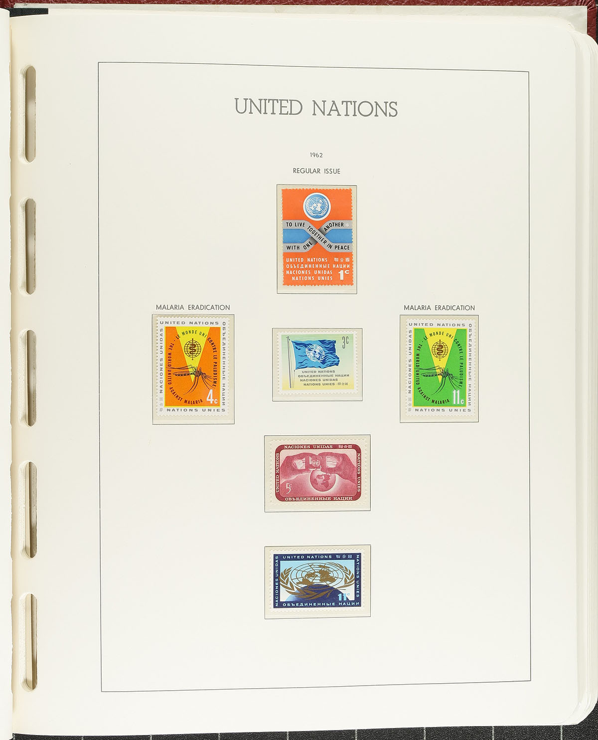 Collection / accumulation of primarily never hinged United Nations, 1950's-2000's, containing over 1,000 stamps in 2 albums, stock pages, and glassines. We note an almost complete collection of New York and Geneva in two Lighthouse Luxus DL springback albums with hingeless pages ranging from 1951 to 1981, along with a stockbook with singles and sheets from the 1960s to the 1980s, a binder of "Flag" series sheetlets, a few presentation and annual collections, and more. A view of catalogue values indicate some items cataloguing $10 and up, including Scott #38 souvenir sheet (nh, c.v. $50). Owner's 2014 Scott catalogue value for the lot totals US$818.00 ($1104.30 CDN). A nice lot for collectors and dealers alike. Estimate =
