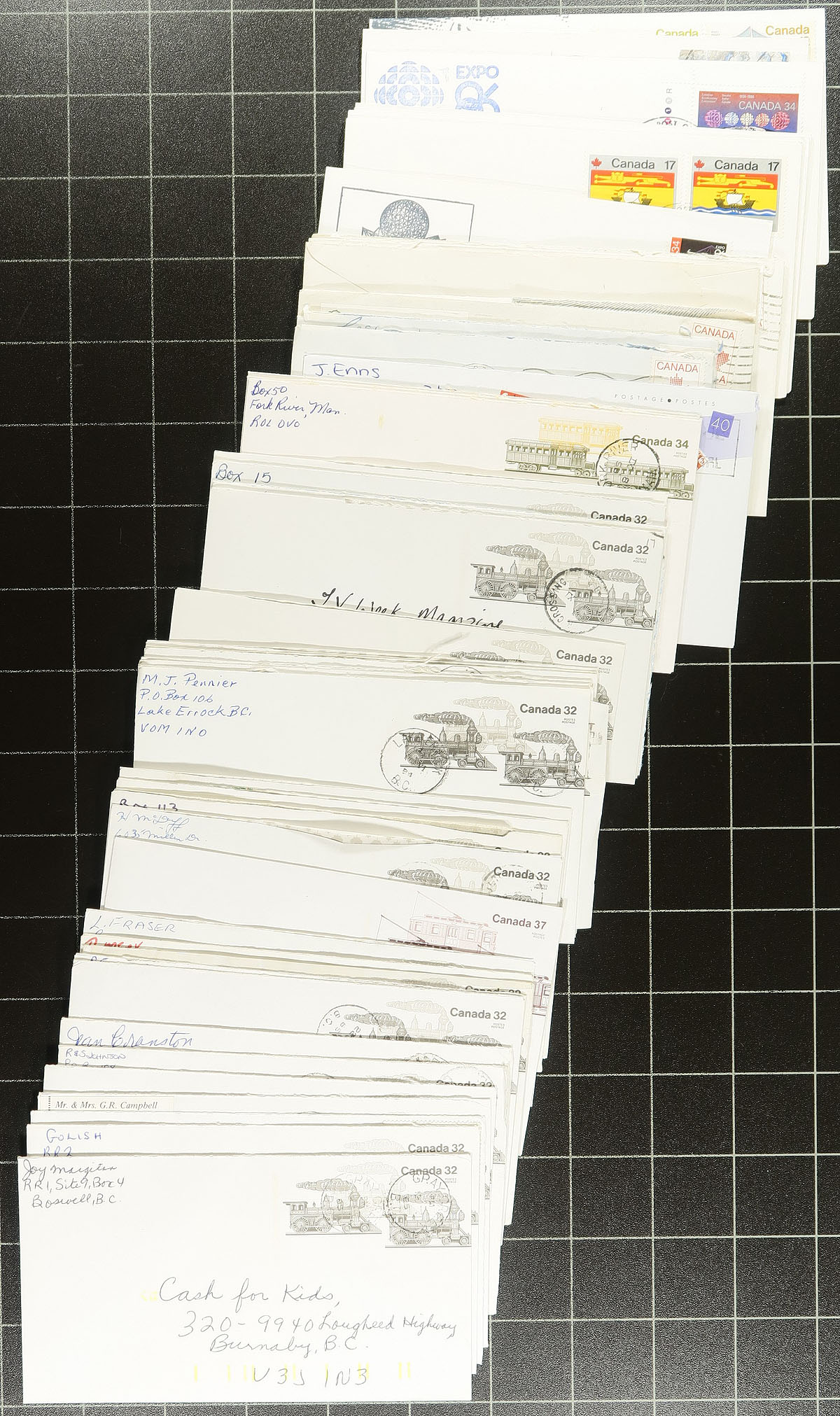 Accumulation of roughly 300 covers collected for British Columbia postmarks, 1960's-1980's, We estimate roughly 100 different towns ranging from A to W, including Francois Lake, Cache Creek, Charlie Lake, Fort St. James, Bridge Lake, Westbank, Coalmont, and much more. Postmark interest includes cds, POCON, Klussendorf, machine, and likely others, with a few towns represented with various postmarks or frankings. The majority of covers are commercial in nature, along with roughly 40 event or first day covers. Condition varies from mixed to very fine as is the nature of commercial mail, overall fine to very fine. Estimate =
