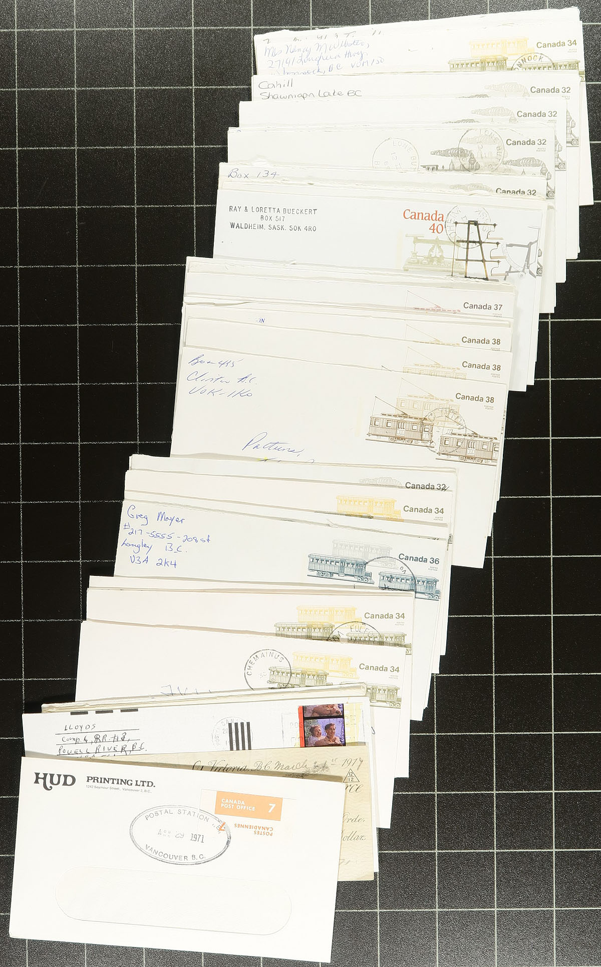 Accumulation of roughly 300 covers collected for British Columbia postmarks, 1960's-1980's, We estimate roughly 100 different towns ranging from A to W, including Francois Lake, Cache Creek, Charlie Lake, Fort St. James, Bridge Lake, Westbank, Coalmont, and much more. Postmark interest includes cds, POCON, Klussendorf, machine, and likely others, with a few towns represented with various postmarks or frankings. The majority of covers are commercial in nature, along with roughly 40 event or first day covers. Condition varies from mixed to very fine as is the nature of commercial mail, overall fine to very fine. Estimate =