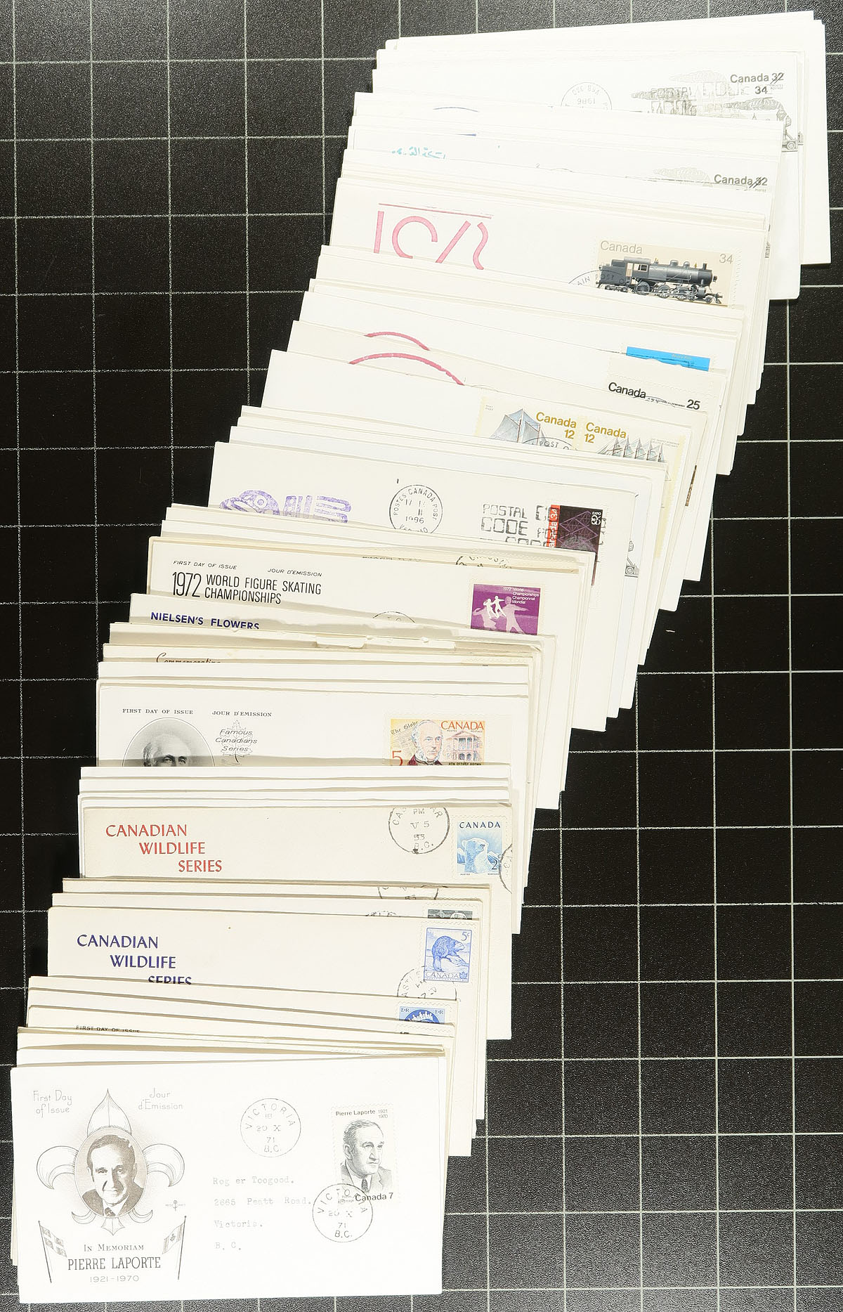 Accumulation of roughly 300 covers collected for British Columbia postmarks, 1960's-1980's, We estimate roughly 100 different towns ranging from A to W, including Francois Lake, Cache Creek, Charlie Lake, Fort St. James, Bridge Lake, Westbank, Coalmont, and much more. Postmark interest includes cds, POCON, Klussendorf, machine, and likely others, with a few towns represented with various postmarks or frankings. The majority of covers are commercial in nature, along with roughly 40 event or first day covers. Condition varies from mixed to very fine as is the nature of commercial mail, overall fine to very fine. Estimate =