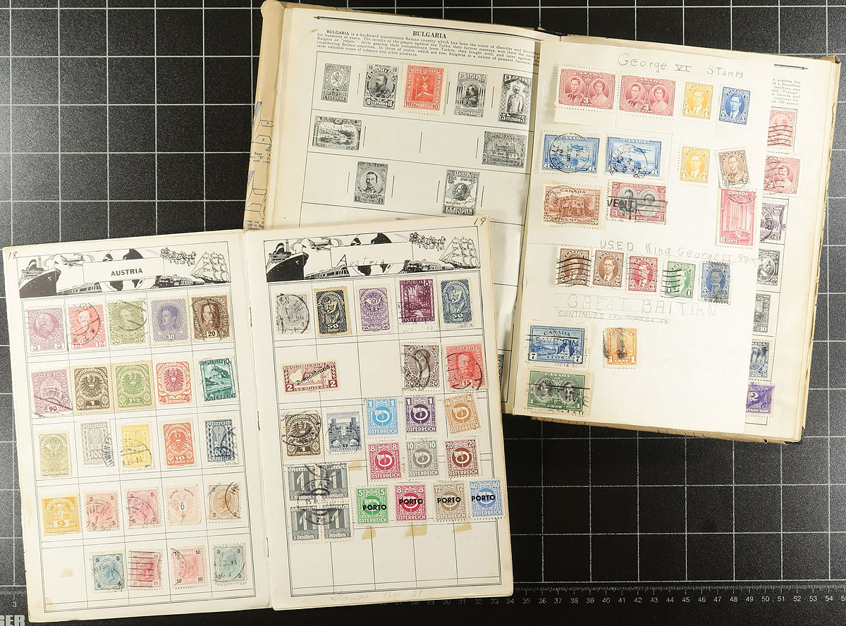 Collections / accumulations of a few thousand worldwide stamps in albums, binders, and stock pages, filling a carton. There is much to digest here including an album of British Commonwealth material, an album each containing Switzerland, Palau, and Tannu Tuva, along with better representation from South America. Almost all the material appears to be used from the 1900s onwards, with strength from the 1930's to the 1960's, leaving better finds to the worldwide collector. Estimate =