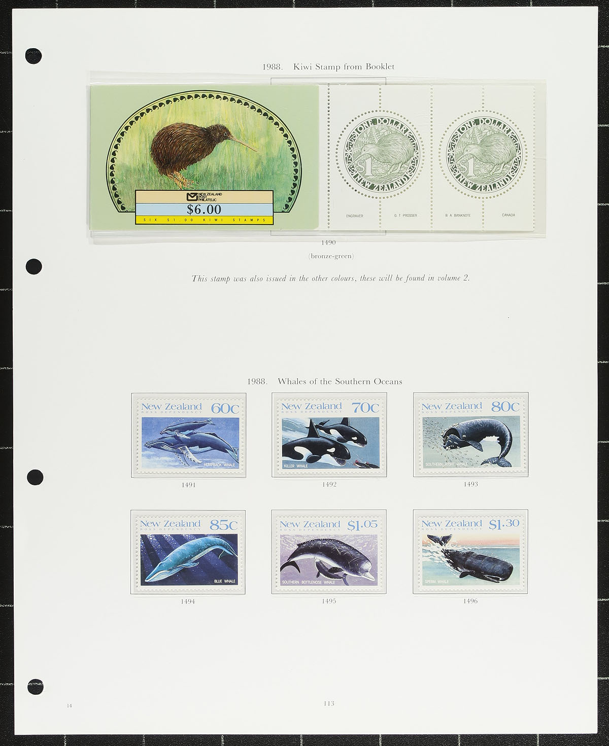 Collection of mint Zealand, 1953-2001, containing roughly 750 stamps in roughly 100 album pages. This neatly organized collection, mostly hinged on pages along with some never hinged material in hingeless mounts, ranges from Scott #280/1719, with strength from 1953 to 1990, with scattered material thereafter. We note singles, sets, back of the book issues, including a few Health panes, with a spot check indicating some items cataloguing $10 and up, including Scott #333-352 (nh, c.v. $80.90). Only a portion of the lot has been catalogued by the owner using a 2004 Scott totaling $419, leaving potential finds to the dedicated collector. Face value alone should be at least a few hundred dollars. Clean and very fine. Estimate =