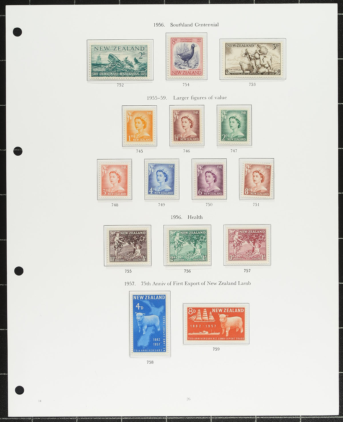 Collection of mint Zealand, 1953-2001, containing roughly 750 stamps in roughly 100 album pages. This neatly organized collection, mostly hinged on pages along with some never hinged material in hingeless mounts, ranges from Scott #280/1719, with strength from 1953 to 1990, with scattered material thereafter. We note singles, sets, back of the book issues, including a few Health panes, with a spot check indicating some items cataloguing $10 and up, including Scott #333-352 (nh, c.v. $80.90). Only a portion of the lot has been catalogued by the owner using a 2004 Scott totaling $419, leaving potential finds to the dedicated collector. Face value alone should be at least a few hundred dollars. Clean and very fine. Estimate =