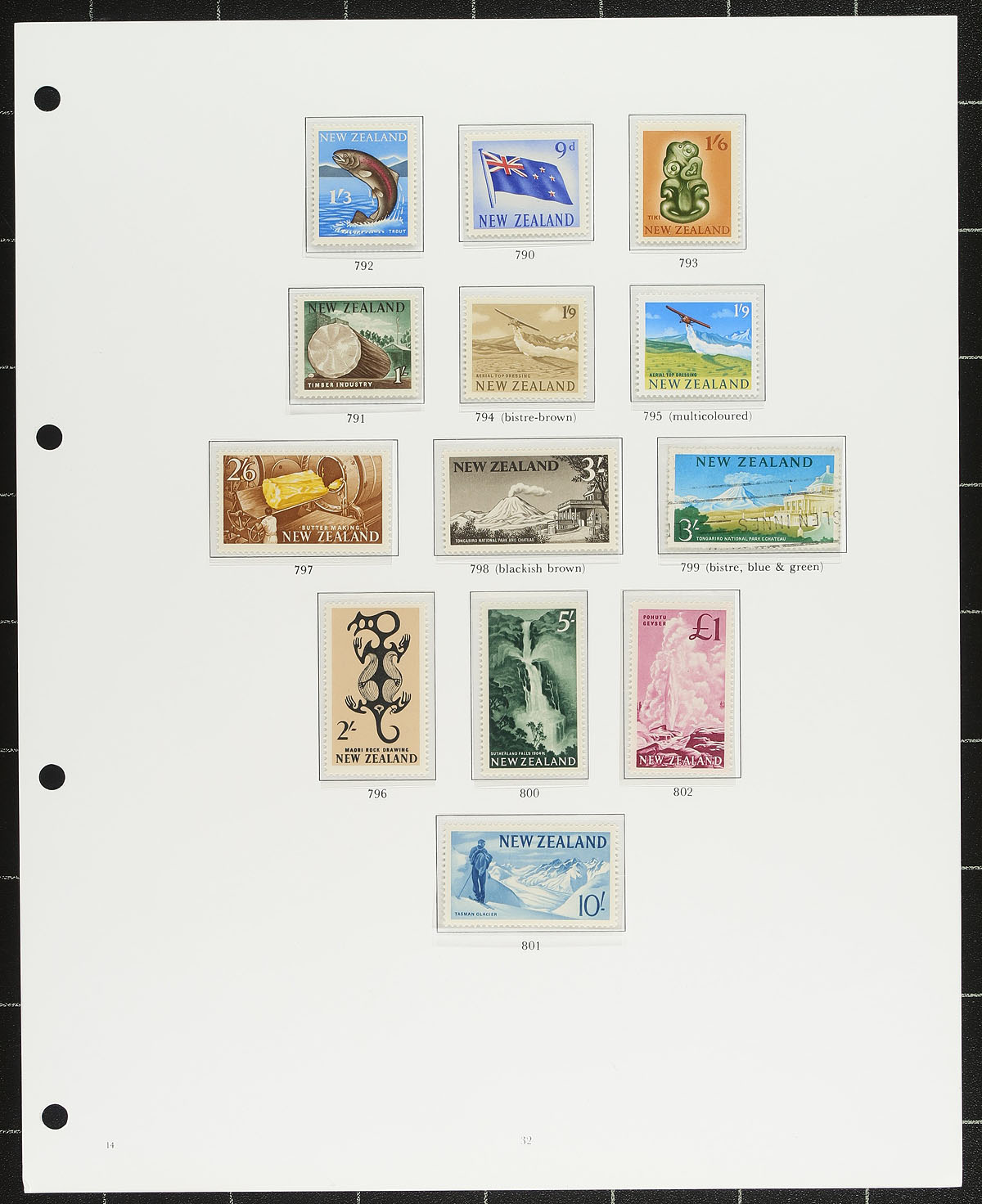 Collection of mint Zealand, 1953-2001, containing roughly 750 stamps in roughly 100 album pages. This neatly organized collection, mostly hinged on pages along with some never hinged material in hingeless mounts, ranges from Scott #280/1719, with strength from 1953 to 1990, with scattered material thereafter. We note singles, sets, back of the book issues, including a few Health panes, with a spot check indicating some items cataloguing $10 and up, including Scott #333-352 (nh, c.v. $80.90). Only a portion of the lot has been catalogued by the owner using a 2004 Scott totaling $419, leaving potential finds to the dedicated collector. Face value alone should be at least a few hundred dollars. Clean and very fine. Estimate =