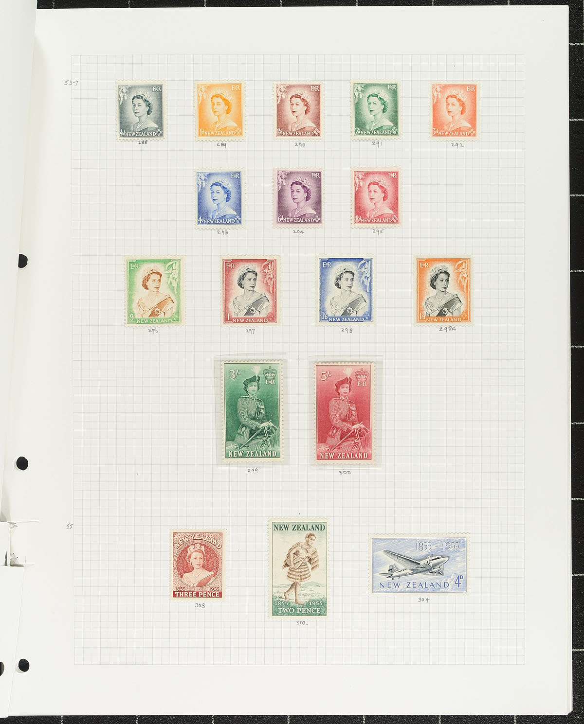 Collection of mint Zealand, 1953-2001, containing roughly 750 stamps in roughly 100 album pages. This neatly organized collection, mostly hinged on pages along with some never hinged material in hingeless mounts, ranges from Scott #280/1719, with strength from 1953 to 1990, with scattered material thereafter. We note singles, sets, back of the book issues, including a few Health panes, with a spot check indicating some items cataloguing $10 and up, including Scott #333-352 (nh, c.v. $80.90). Only a portion of the lot has been catalogued by the owner using a 2004 Scott totaling $419, leaving potential finds to the dedicated collector. Face value alone should be at least a few hundred dollars. Clean and very fine. Estimate =