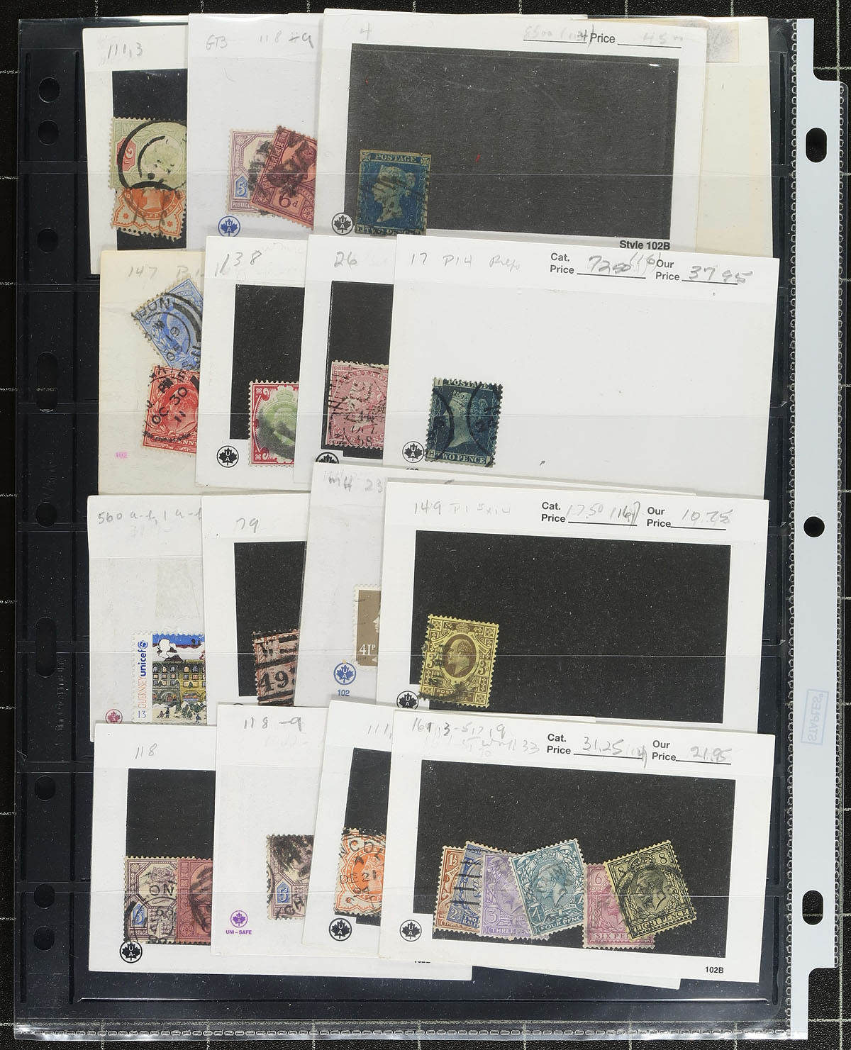 Accumulation of used Great Britain, 1840's-2001, containing a few thousand stamps in several album or stock pages, along with a few glassines. The lot generally ranges from Scott #3/2006, noting roughly 100 Victorian issues, Seahorses (2sh-5sh), back of the book issues, and more. A very quick check of material revealed Scott #s 3, 4, 26, 61 (x2, plate 11, 14), 99, 101, 140, along with several Jubilee issues, and more, noting several 'sock on the nose' town cancels. A nice accumulation for the Great Britain collector with potential finds for the dedicated collector. A few faults to be expected, overall fine to very fine. Estimate =
